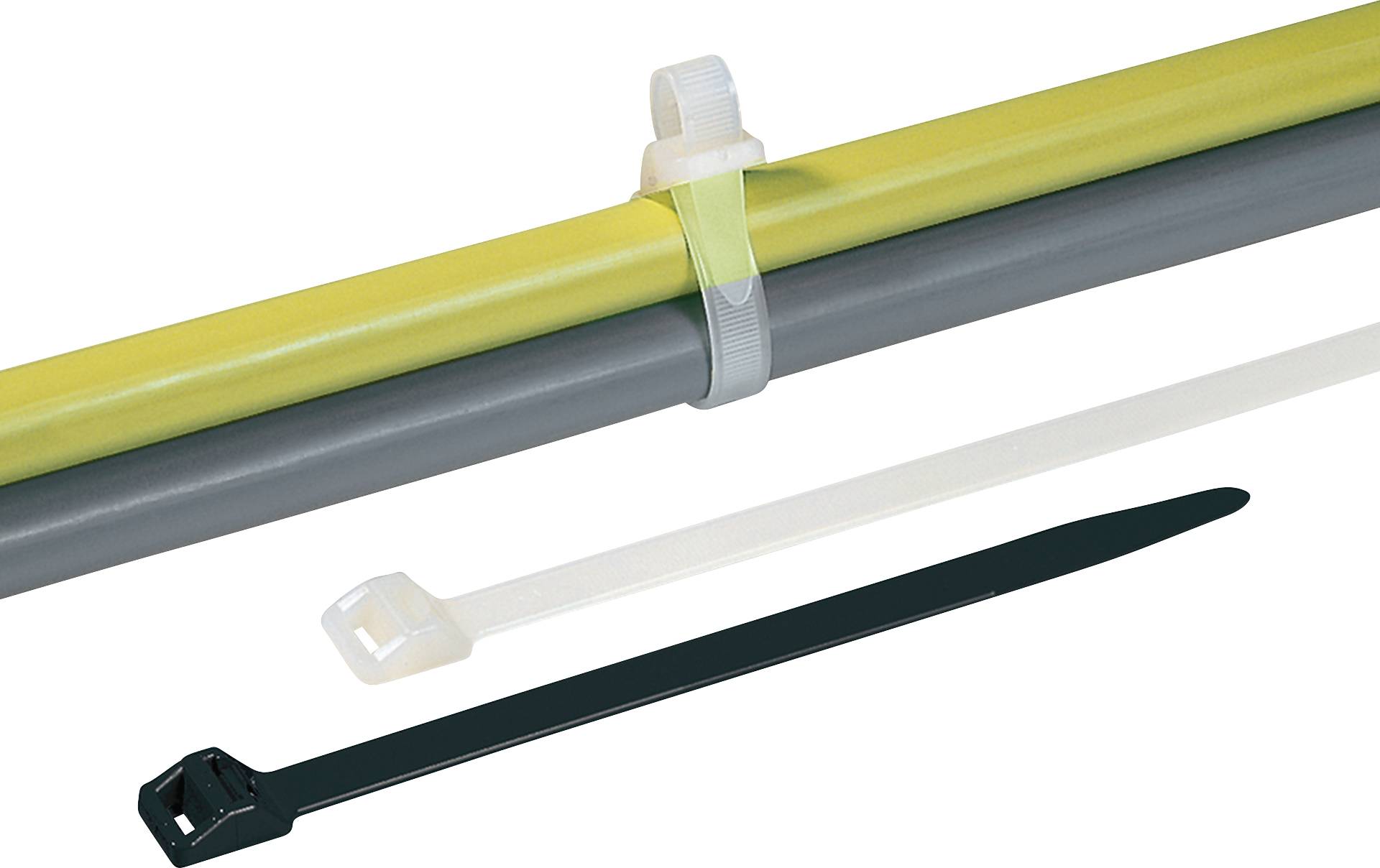 Innenverzahnter Kabelbinder zum Lösen und Wiederverwenden. Für große und/oder schwere Bündel geeignet. Mit Rückschlauföse für überstehendes Bandende. In schwarz und natur erhältlich. Hebelverschluss für einfaches und schnelles Lösen des Kabelbinders. Zurückgeschlauftes Band schützt vor versehentlichem Öffnen Der RT250 ist ein lösbarer Kabelbinder und kann wiederverwendet werden. Aufgrund seiner Haltekraft von 1115 N eignet sich der Kabelbinder hervorragend, um große und/oder schwere Bündel zu fixieren. Für Außenanwendungen werden UV witterungsstabile Kabelbinder aus PA66W empfohlen. Kürzere, lösbare Kabelbinder mit gleicher Haltekraft, werden durch die REL250-Serie abgedeckt