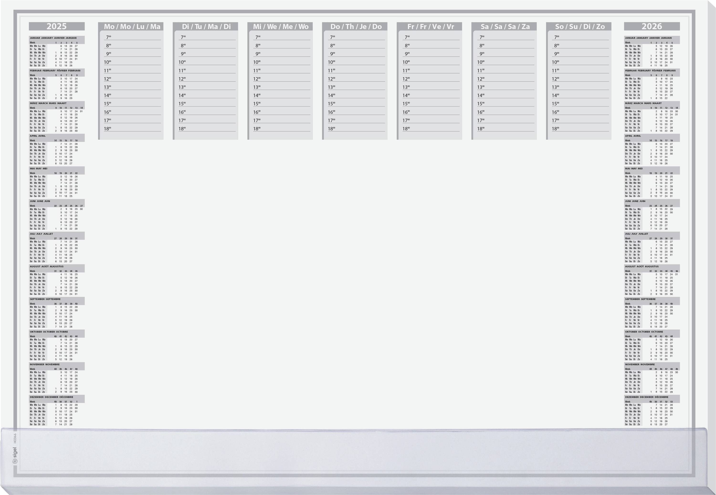 Diese Schreibtischunterlage aus Papier ist die perfekte Notiz-Zentrale für Büro und Homeoffice. Jedes Blatt enthält eine Wochenübersicht mit Stundeneinteilung. Zusätzlich haben Sie ausreichend Platz für Ihre Notizen. Das Papier ist hochwertig: Häufiges Verschieben der Tastatur oder Radieren hält es mühelos aus. Die Verleimung an der Unterkante und partiell an der Oberkante verhindert das Ausfransen der Ecken. Für das Extra an Stabilität sorgt der Kantenschutz aus Kunststoff an der Unterseite. Da dieser transparent ist, können Sie darunter übersichtlich Notizzettel verstauen. Das Kalendarium und die Wocheneinteilung sind 4-sprachig. Schaffen Sie mit dieser Schreibunterlage Ordnung an Ihrem Arbeitsplatz. FSC-zertifiziert: hochwertiges, umweltfreundliches Papier aus verantwortungsvollen Quellen.
