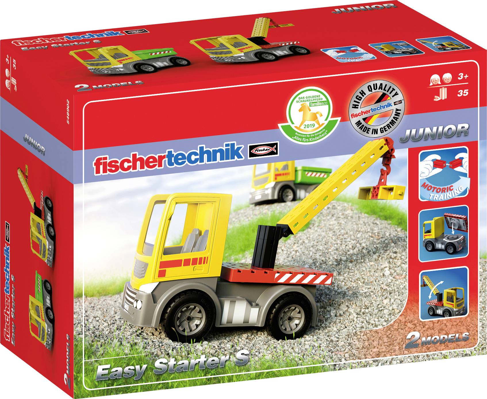 Mit dem neuen fischertechnik System können jetzt bereits junge Konstrukteure ab 3 Jahren die fischertechnik Welt erleben. Das einfache Verbindungssystem ermöglicht den kleinen Baumeistern schnellen Erfolg und viel Spielspaß. Die neuen, großen Bauelemente in Verbindung mit der kindgerechten Bauanleitung erleichtern den Start ins fischertechnik System. Mit diesem Einsteiger-Baukasten lassen sich verschiedene LKW Modelle bauen. An das Führerhaus kann sowohl eine Mulde als auch die fischertechnik Bauplatte angebaut werden. Mit Hilfe der Anleitung können die kleinen Baumeister auf die Bauplatte aufbauen oder auch kreativ verschiedene Aufbauten konstruieren.Das neue System sorgt nicht nur für Spielspaß im Kinderzimmer, sondern fördert auch die motorischen Fähigkeiten der Kinder.
