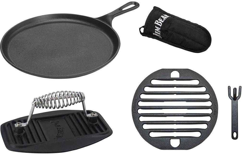 Dieses Gusseiserne Grillrost 5in1 Set von Jim Beam ist ein absolutes Muss in Sachen Grillzubehör und beinhaltet alle Grillutensilien, die Sie überall und zu jeder Zeit einsetzen können. Der runde Rost wurde sorgfältig gefertigt, um perfekt auf die Grillplatte aus Eisen zu passen. Somit besitzen sie die beste Kombination für das Grillen im Innenbereich. Das vielseitige Set kann auch draußen auf dem Grill oder am Lagerfeuer verwendet werden. Mit dem gusseisernen Heber können Sie den Rost sicher von der heißen Oberfläche abheben. Der hitzebeständige Griffschutz deckt den Pfannenstiel ab, um Ihre Hand während des Grillens zu schützen. Die Fleischpresse glättet gleichmäßig, während unerwünschtes Fett herausgedrückt wird. Das Set eignet sich perfekt zum Grillen von Fleisch, Geflügel, Fisch, Obst, Gemüse und mehr.