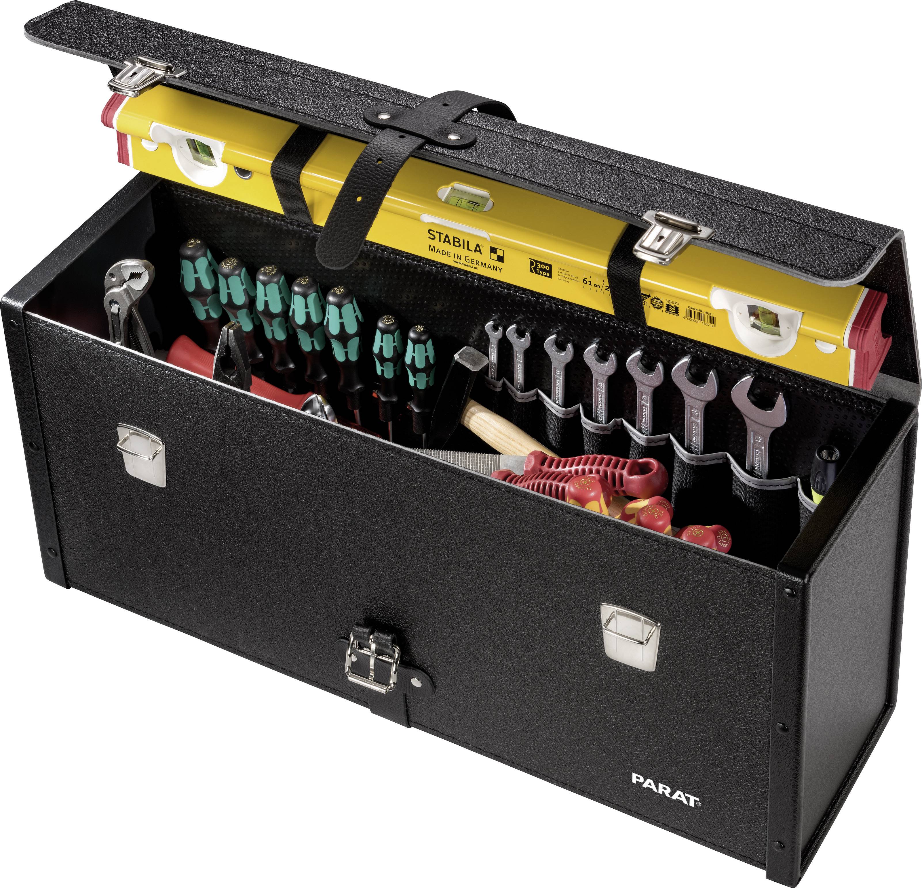 Die Premium-Werkzeugtasche KingSize Long von PARAT aus der Produktreihe NEW CLASSIC, bedient vor allen Dingen die gewerksspezifischen Anforderungen aus dem Sanitärhandwerk. Die rund 635mm lange Tasche ermöglicht den Transport von extra langen und großen Handwerkzeugen und fasst insgesamt ca. 45 Liter. Das geprägte schwarze Industrieleder, ist widerstandsfähig, abwischbar und daher sehr pflegeleicht und unempfindlich. Integrierte strapazierfähige Kunststoffseitenteile verstärken die PARAT Werkzeugtasche und bieten zudem Schutz vor Kratzern. 13 feste Werkzeugschlaufen in der Vorderwand, acht genähte Separationen und sieben weitere feste Schlaufen in der Rückwand, sowie praktische Halteschlaufen im Deckel der Werkzeugtasche, ermöglichen ein übersichtliches Verstauen und sicheres Transportieren der benötigten Werkzeuge. Zwei Steckschlösser und ein umlaufender Riemen sichern das Werkzeug vor Diebstahl. Die extra lange PARAT NEW CLASSIC KingSize Long ist im täglichen Arbeitseinsatz für extra langes und extra viel Werkzeug ideal geeignet.