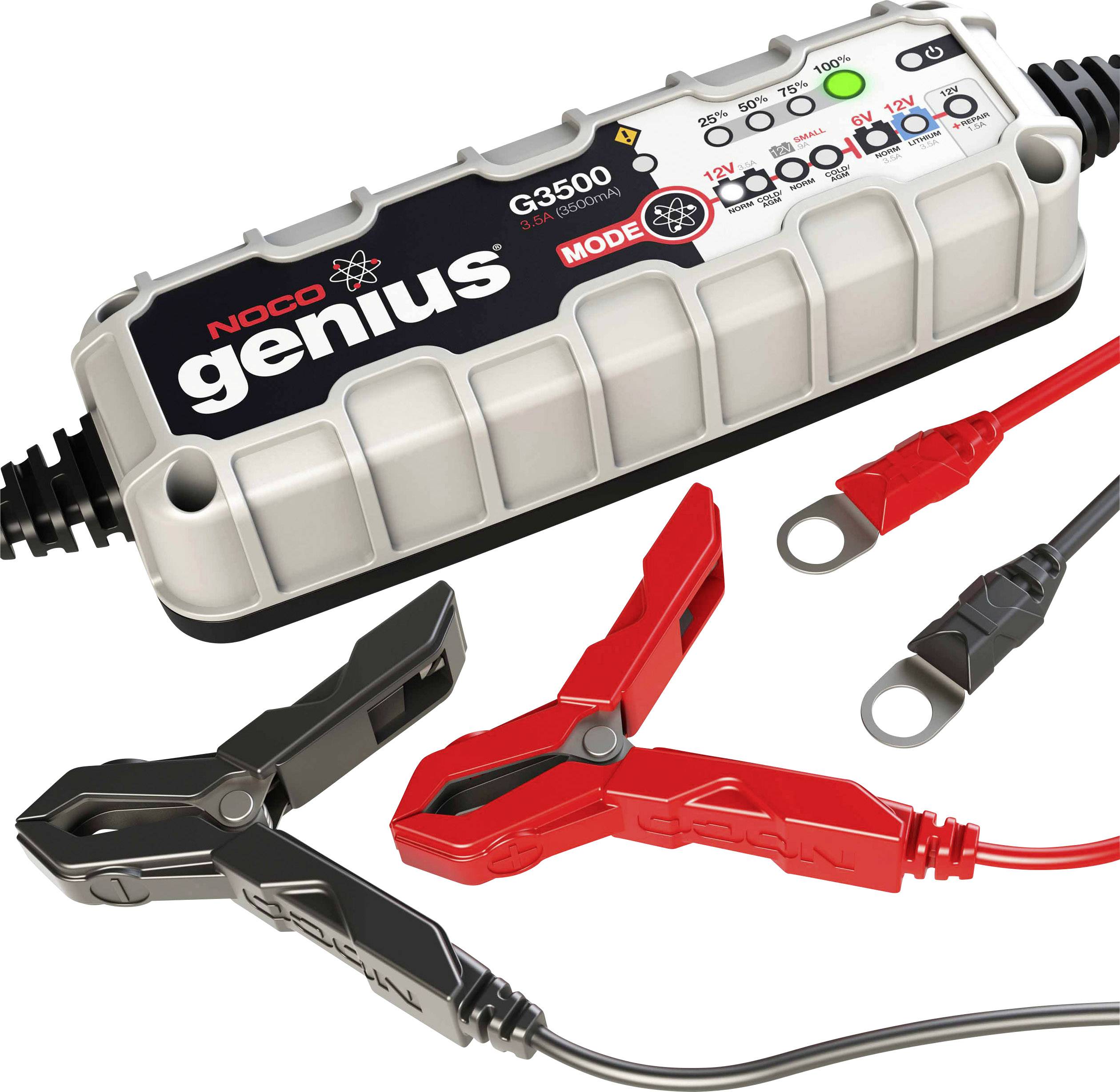 Noco Genius Ladegerät G3500 6/12V 3,5A für Blei- und Lithium-Akkus. Das Noco Genius G3500 ist ein universelles Ladegerät mit dem Sie 6V & 12 V Blei- und 12V Lithium-Ionen-Batterien in PKW, LKW, Booten, Wohnmobilen u.v.m. bis 120Ah sicher laden und warten können. Die Elektronik des Ladegeräts passt den Ladestrom und die Ladespannung den Anforderungen Ihres Akkus an. Das Noco Genius G3500 verfügt über ein spezielles Reparaturprogramm zu Wiederherstellung, Reparatur und Lagerung alter, ungenutzter, sulfatierten oder von Säurebeschichtung betroffenen Akkus.