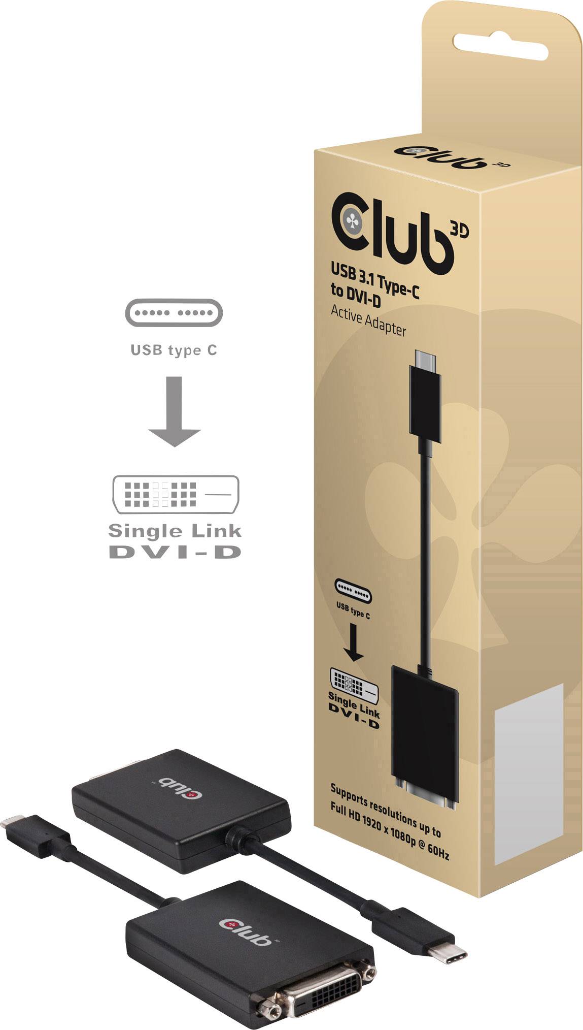 Der Club 3D ist ein aktiver DVI Signalwandler. Der USB 3.1 Typ-C auf DVI-D Adapter ist die einfachste Lösung um Ihre USB 3.1 Typ C Quelle mit DisplayPort™ Alternate Mode mit einem DVI-D fähigen High Definition Monitor, TV oder Projektor zu verbinden. Der Adapter ist kompakt und sehr gut mitnehmbar. Versorgt über den USB-C® Port, benötigt der Adapter keine externe Stromversorgung und ist ideal mit den neuesten Notebooks und Ultrabooks zu nutzen.