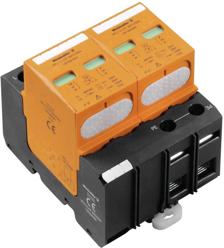 Mehrpoliger Blitzstromableiter nach den Anforderungen der Klasse I nach der IEC 61643-11, EN61643-11:2013 dient der Ableiter aus V0 Material beim Übergang der Schnittstellen 0 auf 1 (nach IEC 1312-1) als Blitzschutzpotentialausgleich und wird in Applikationen nach IEC 61643-12 eingesetzt. Durch die Verwendung einer nicht ausblasenden Funkenstrecke in Kombination mit einem Hochleistungsvaristor werden die Anforderungen zur Überprüfbarkeit von Überspannungsschutz-Schutzeinrichtungen der Klasse I aus der VDEW-Richtlinie erfüllt. Der Ableiter wird in die Nähe der Einspeisung der zu schützenden Anlage in einer handelsüblichen Installations-/ Verteilergehäuse installiert. Der VPU I 2 LCF 280V/25kA Wird im Einphasen-Netz eingesetzt. Mit thermischer Abtrennvorrichtung des Varistors. Wenn kein Schutz mehr vorhanden ist, ändert sich die Farbe im Anzeigefenster von grün auf rot.