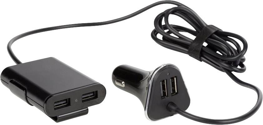Das Kfz-Ladegerät verfügt über 2 USB-Anschlüsse direkt beim Zigarettenanzünder sowie ein 1,8 m langes Verlängerungskabel, an dessen Ende sich zwei weitere USB-Anschlüsse befinden – ideal für Ihre Mitfahrer im Fond!