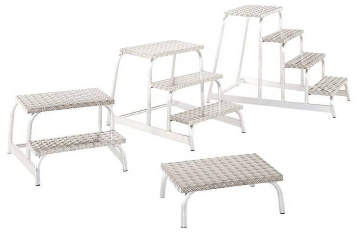 Maschinentritt - - Aufstieg einseitig - Verschweißte Rohrkonstruktion aus Aluminium. Stufen: - Aus rutschsicherem Riffelblech. Podest: - Durch eine Querstrebe versteift. Ausstattung: - Holmenden mit Kunststoff-Abschlüssen - Mit rutschsicheren Fußkappen. Zubehör (bitte separat bestellen): - Federbremsrollen - Handlauf - Fußplatten.