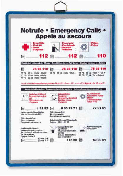 Sichttafel, DIN A4 im Hochformat, Rahmen aus Stahldraht mit Kunststoffummantelung in blau, Sichttafel aus Kunststoff, zur Befestigung an der Wand, Rahmen mit Metallöse.