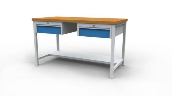 Werkbank, Höhe x Breite x Tiefe 860 x 1500 x 750 mm, Tischplatte aus Buche-Massivholz, geölt, Plattenstärke 40 mm, Traglast 100 kg, Gestellausführung 4 Füße, Unterbau 2 Schubladen, 1/2 Ablageboden, links 1 Schublade, mitte 1/2 Ablageboden, rechts 1 Schublade, Schubladen Höhe 2x150 mm, Schubladennutzmaß Breite x Tiefe 450 x 600 mm, Traglast je Schublade 100 kg, Schubladen mit kugelgelagerter Rollenführung, Auszug 100 %, Schubladen zur Aufnahme von Einteilungsmaterial geschlitzt, mit Einzelauszugsperre, mit Griffleiste, mit Beschriftungsstreifen, verschließbar mit Zylinderschloss, Stahlkonstruktion, Gestell mit Pulverbeschichtung in Farbe wählbar, Front mit Pulverbeschichtung in Farbe wählbar.