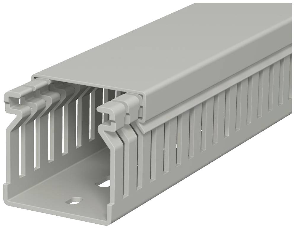 Verdrahtungskanal inkl. Oberteil und Bodenlochung zur waagerechten und senkrechten Verlegung elektrischer Kabel und Leitungen im Schaltschrank. Ausführung als metrischer Kanal. Das Nennmaß der Systemgröße entspricht dem Innenmaß der Kanäle. Das Ausbrechen der Stege erfolgt werkzeuglos. Bodenbündiges Ausführen ist durch Sollbruchstellen möglich. Geprüft nach DIN EN 50085-2-3.