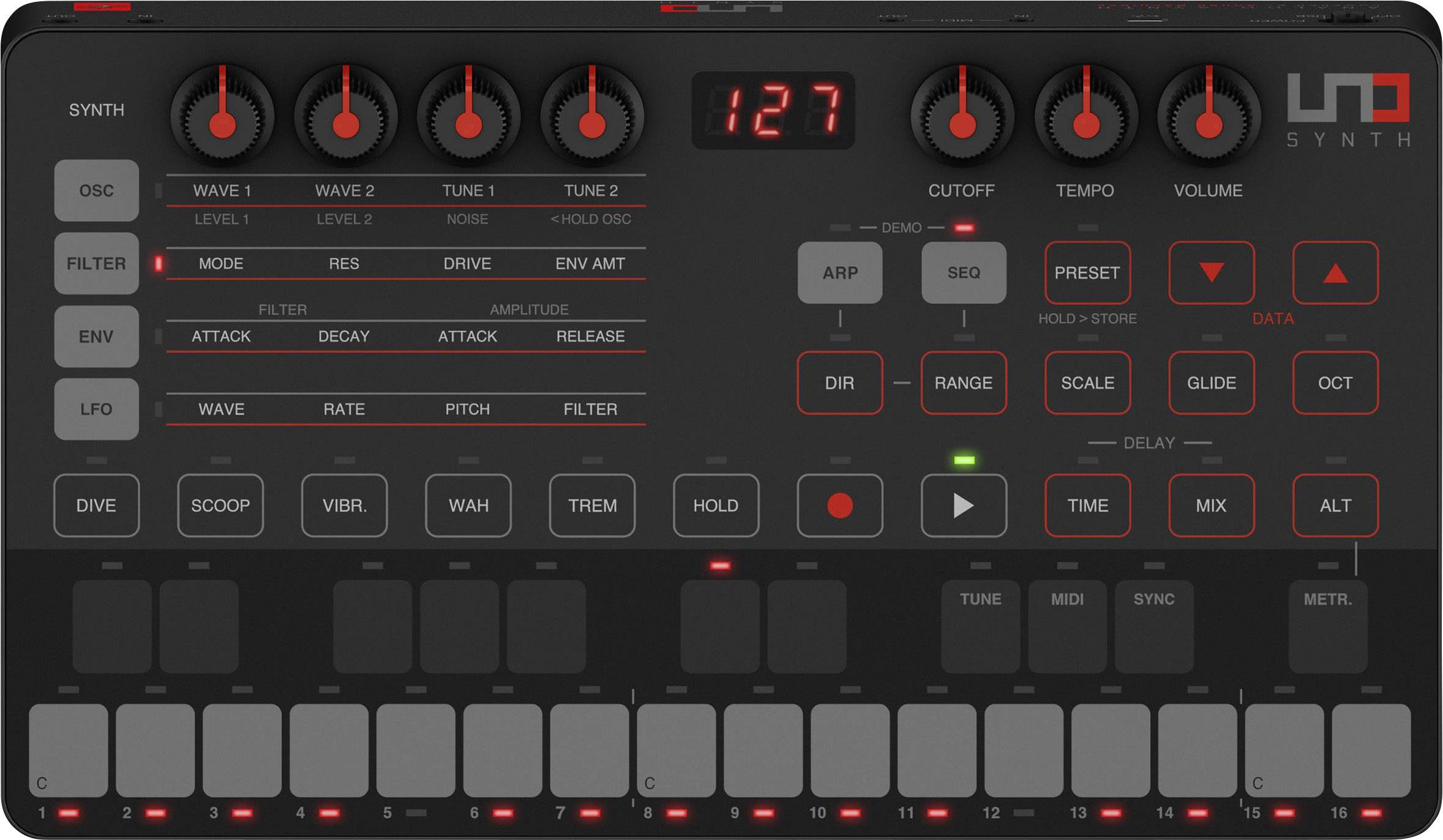 UNO Synth ist mit einer Soft-Klaviatur aus 27-Multifunktions-Tasten ausgestattet, deren zwei Oktaven sich entweder regulär chromatisch oder mit 13 unterschiedlichen Skalen einsetzen lassen. Der eingebaute Arpeggiator bietet mit 10 verschiedenen Mustern und einem 4-Oktaven-Bereich noch mehr kreative Möglichkeiten für Keyboarder und viel Spaß für Einsteiger. Die Tastatur dient gleichzeitig als Step-Edit-Steuerung für den eingebauten 100-Pattern-Sequenzer, der wahlweise in Echtzeit oder Step-by-Step programmiert werden kann. Pro Step stehen darüber hinaus weitere modulierbare Synth-Parameter zur Verfügung, was den UNO-Synth-Sequenzer zu einem der mächtigsten seiner Klasse macht. Sein integrierter Audioeingang für den Anschluss von Audio-Instrumenten wie z. B. einer Drum-Maschine machen einen zusätzlichen Mixer obsolet.