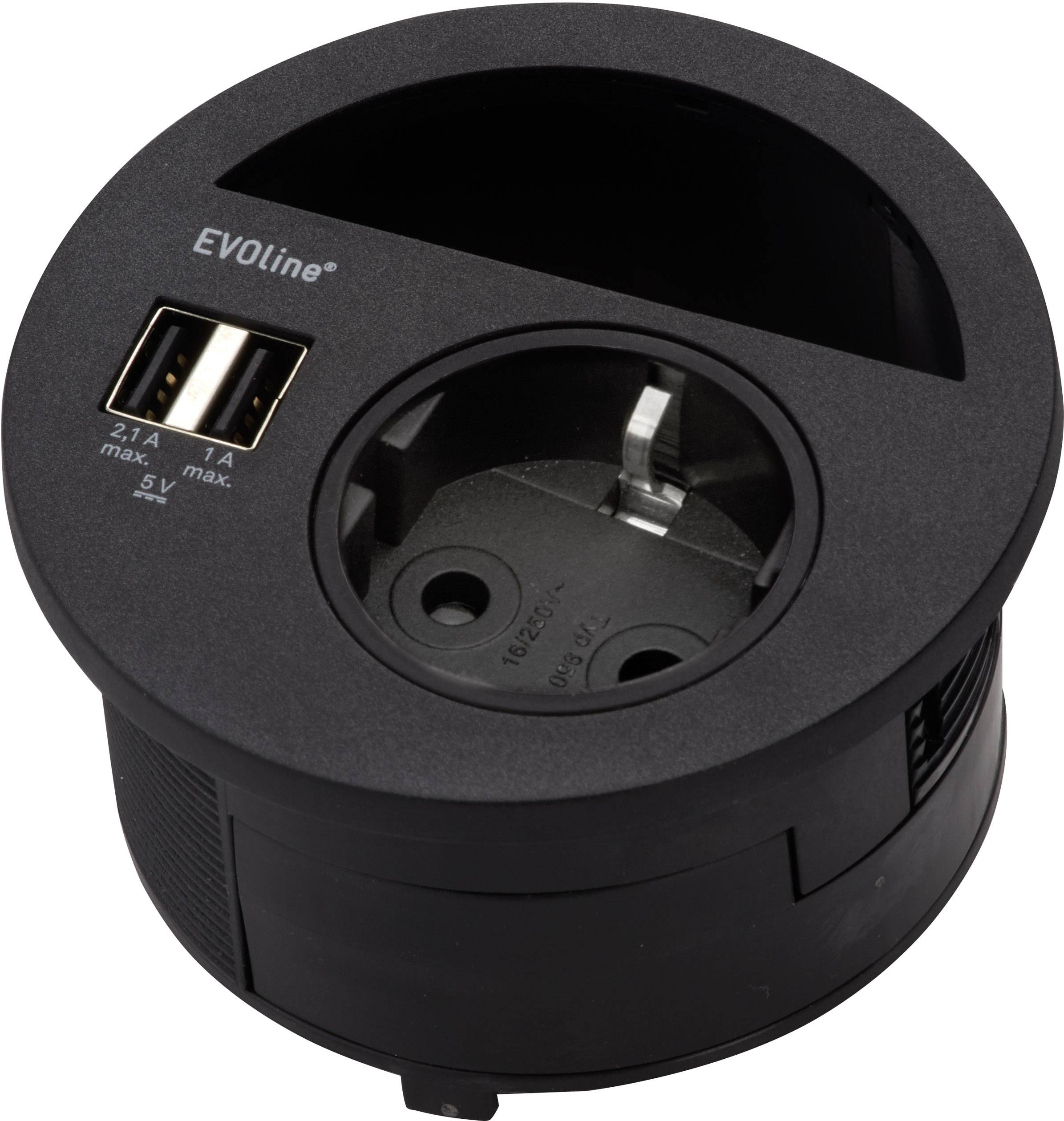 Der EVOline Circle80 bietet eine Steckdose, einen USB-Charger und eine Kabelführung für den Einbau in Tischen.