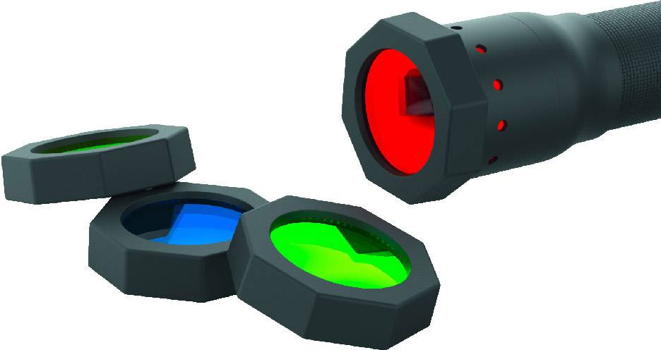 Rotfilter: erhält die Nachtsichtfähigkeit ohne die Dunkeladaption des Auges zu beeinträchtigen · Blaufilter: erleichtert Spurensuche (Flüssigkeiten – Blut/Schweiß) für Polizei, Feuerwehr und Sicherheitsdienste · Grünfilter: erleichtert Wildfütterung und Wildbeobachtung · Gelbfilter: sorgt für bessere Sicht bei Nebel