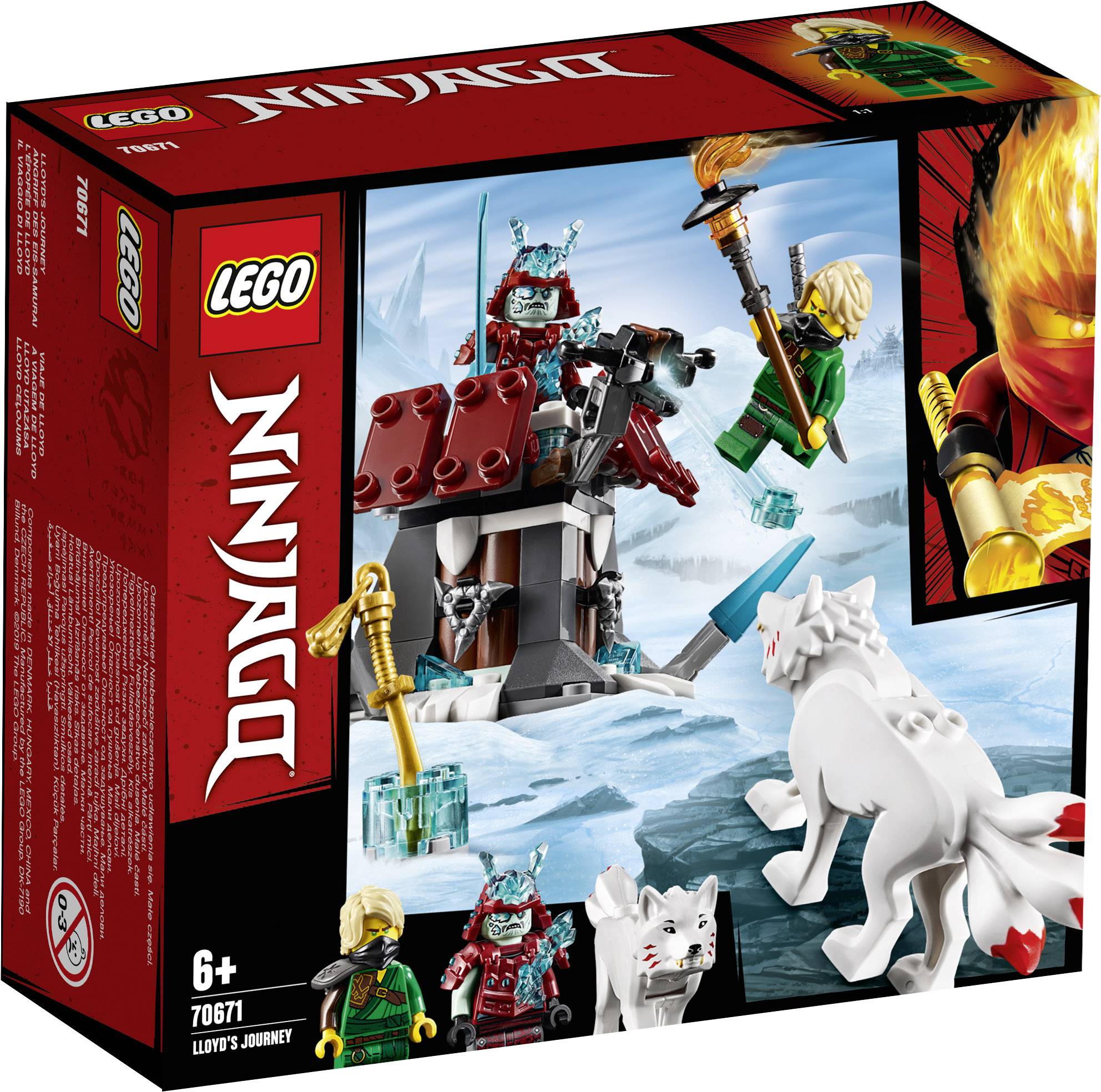 Dieses LEGO® NINJAGO® Set enthält 2 Minifiguren (neu ab Juni 2019): Lloyd und den Eis-Samurai sowie eine Figur von Lloyds Wolf (neu ab Juni 2019). · Cooles Spielzeug für Kinder, die aus LEGO® Steinen die Festung des Eis-Samurai bauen können, die Platz für eine Minifigur bietet und über eine Spielzeug-Armbrust sowie Eiselemente verfügt. · Dieses Action-Bauspielzeug enthält zudem eine Eishalterung zum Zusammenbauen für Lloyds goldenes Schwert. · Zur Ausrüstung gehören die brennende Fackel und das silberne Spielzeug-Katana der Ninja-Minifigur Lloyd sowie das Eiskatana des Eis-Samurai. · Das Spielset enthält außerdem eine Halterung für Lloyds Katana und Elemente für die Eisrüstung des Eis-Samurai. · Cooles Spielzeug für Kinder, um damit die spannende Action aus der NINJAGO® TV-Serie nachzuspielen. · Für noch mehr Abenteuer mit Lloyd in der Nimmer-Welt kannst du das Set mit den LEGO® Sets „Lloyds Titan-Mech“ (70676) und „Festung im ewigen Eis“ (70678) kombinieren. · Die Festung ist 5 cm hoch, 7 cm breit und 7 cm tief.