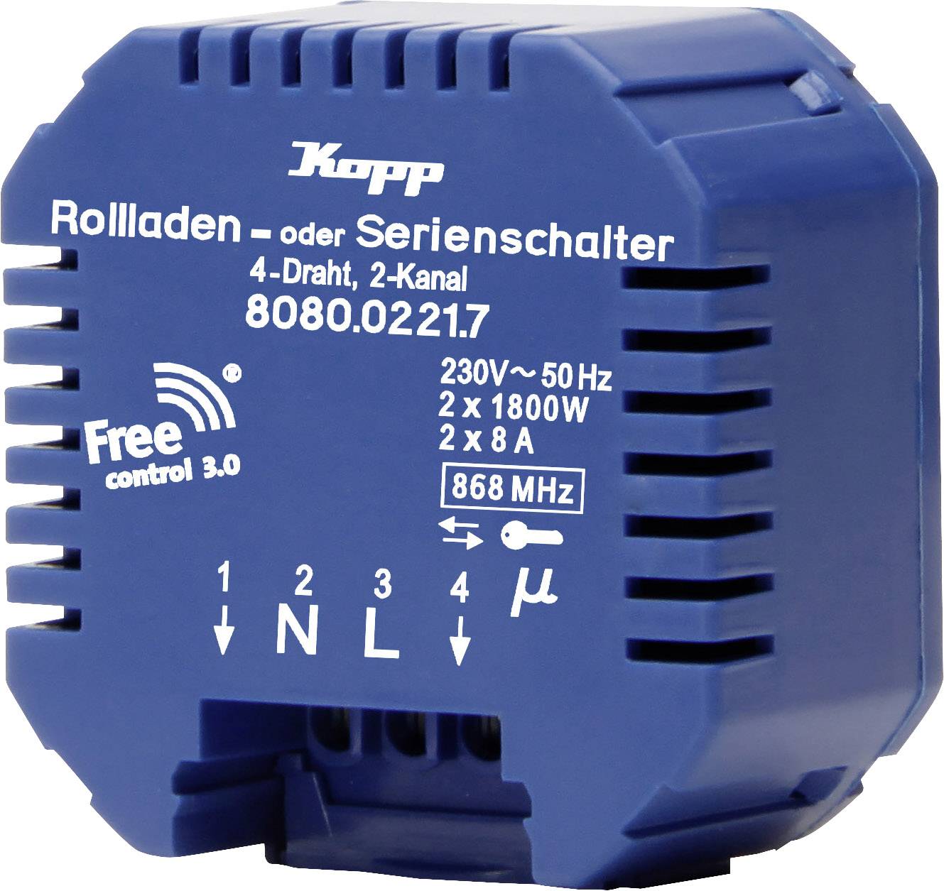 2 Schaltkontakte · Umschaltbar zwischen den Funktionen: Serienschalter, Jalousien-, Markisen-, Rollladensteuerung · Integrierte Feldstärkenanzeige · Verschlüsselter Funk · Zum Nachrüsten geeignet: Kein Netzanschluss, kein Schmutz · Bidirektionale Datenübertragung - Rückkopplung zum Betriebsstatus · Steuerung über Kopp HomeControl App mithilfe Gateway Mini.
