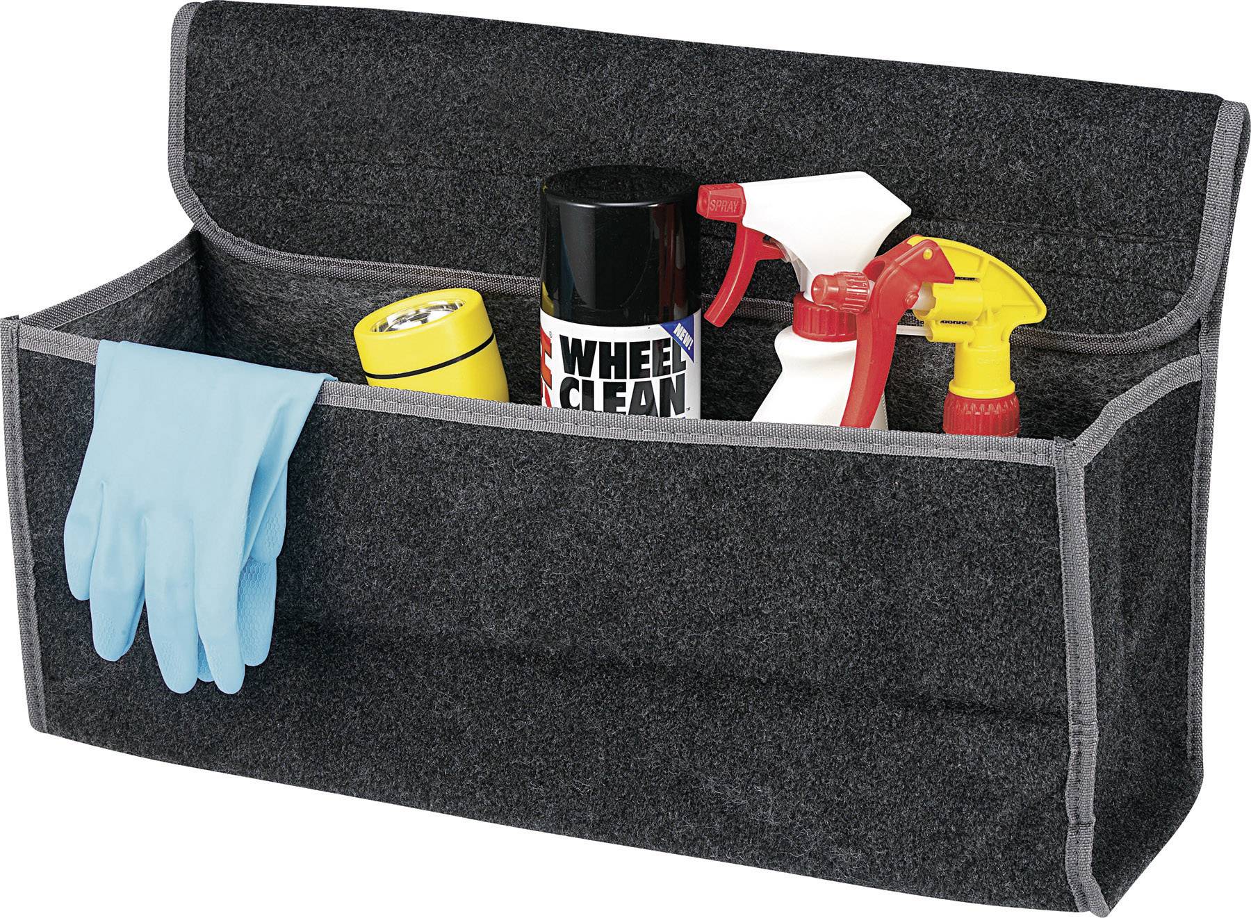 Die Kofferraumtasche aus Nadelfilz bietet viel Stauraum und durch Befestigung mittels Klettband festen Halt im Fahrzeug.