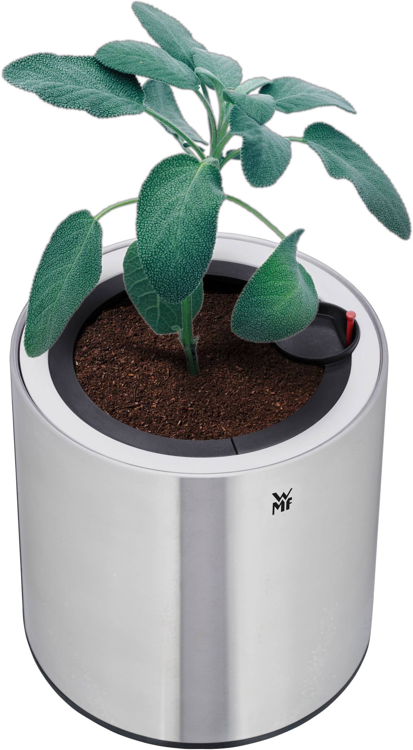 Bestens geeignet für Blumen- oder Kräutertöpfe mit einem Durchmesser von 12 bis 13 Zentimetern, elegant im Design, mit einem hochwertigen Gehäuse aus Cromargan® und äußerst praktisch: Der Pflanzenübertopf WMF Ambient Kräuter @home Single hat sozusagen einen grünen Daumen. Das integrierte, intelligente Selbstbewässerungssystem mit Dochtbewässerung garantiert mindestens zu vier Tage eine perfekte Versorgung der Pflanzen mit Wasser und verhindert dabei zuverlässig eine Über- oder Unterdosierung. Der aktuelle Wasserstand ist mühelos ablesbar, die Befüllung des Tanks ist ohne Entnahme der Pflanze möglich. Besonderer Clou: Das Ambient Light sorgt in drei Helligkeitsstufen für eine wunderschöne Stimmung. Einfach das Gehäuse berühren und schon leuchtet es (WMF Easy Touch Technologie). Das extra lange, abnehmbare Stromkabel erlaubt das Aufstellen an beinahe jedem Indoor-Standort.