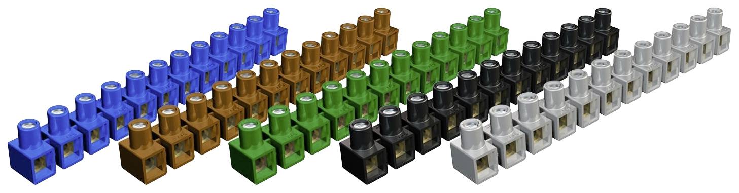Klemmen Messing, Schrauben Stahl, galvanisch verzinkt und transparent passiviert, 12-polige, in Einzelklemmen abtrennbare Leiste, nur einseitig offen. Einseitig geschlossen, Schrauben hochgedreht, unverlierbar. Nennquerschnitt 2,5 mm² Nennspannung 250 V Nennstrom 24 A Max. anschließbare Querschnitte je Klemmstelle: 4 x 2,5 mm², 5 x 1,5 mm² oder 6 x 1 mm². Lieferung farbig sortiert: 3 schwarze, 2 blaue, 3 gelb-grüne, 1 brauner und 1 grauer Streifen je Verpackungseinheit.