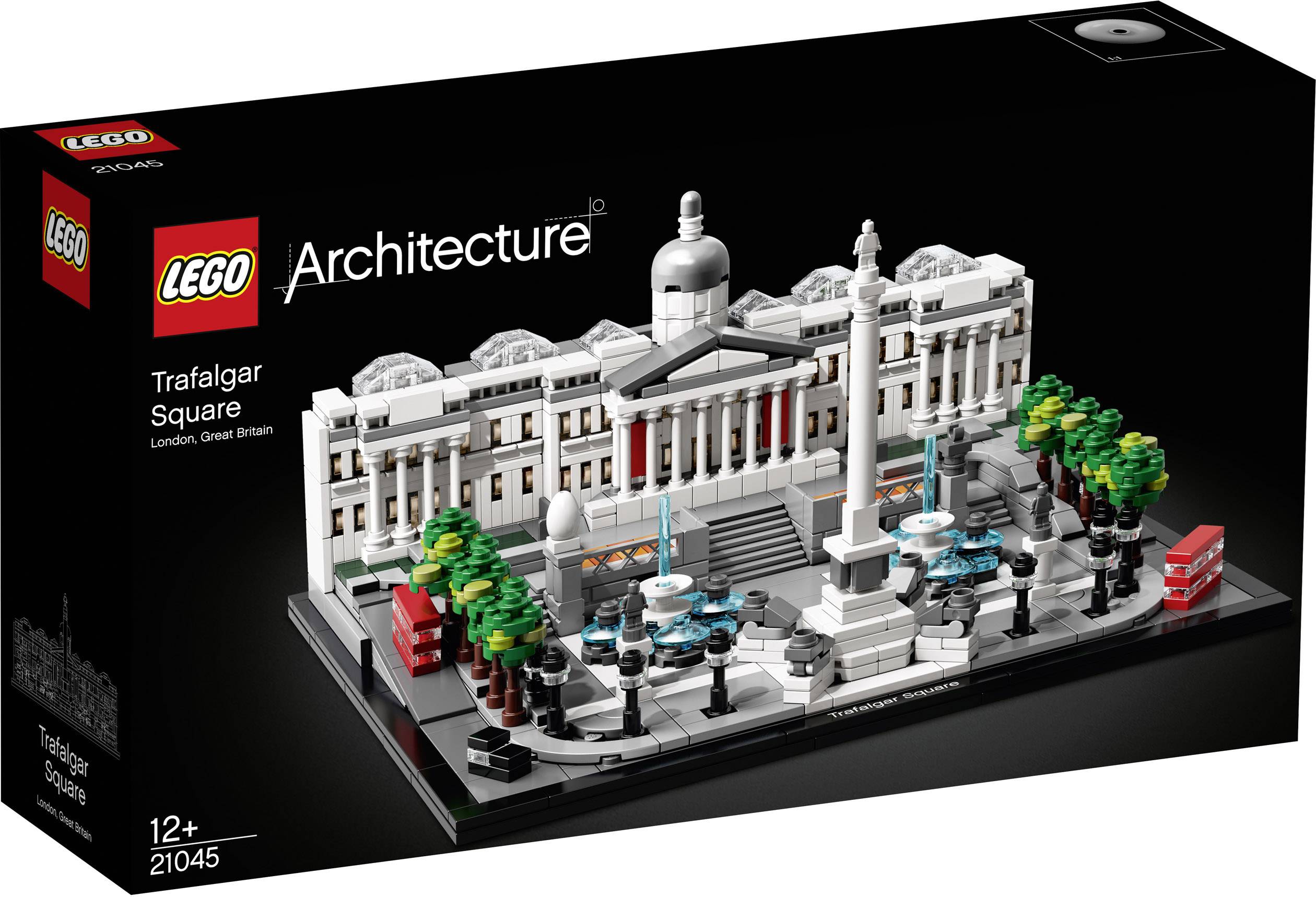 Mit dem LEGO® Architecture Set „Trafalgar Square“ (21045) können Sie die Essenz eines historischen Wahrzeichens von London einfangen. Der Platz wurde zu Ehren von Admiral Horatio Nelson nach seinem Seesieg über Napoleon im Jahr 1805 benannt und ist seither eine beliebte Touristenattraktion und ein bevorzugter Ort für politische und gesellschaftliche Veranstaltungen. Die detaillierte LEGO Interpretation zeigt die National Gallery mit ihrer berühmten Kuppel und Säulenfassade, die Nelsonsäule (bewacht von 4 Löwen), die beiden Brunnen des Platzes und die 4 Statuensockel. Sie können die Abschnitte auf der Rückseite der National Gallery entfernen, um Zugang zu einem detaillierten Innenraum mit einer baubaren Statue und Gemälden zu erhalten. Baumgesäumte Abgrenzungen, kunstvolle Laternen, 2 Londoner Busse, 2 schwarze Taxis und eine mit Platten besetzte Grundplatte, die den Platz und die umliegenden Straßen darstellt, runden das Modell ab. Vollendet wird das Sammelset mit einem dekorativen Namensschild. Es bietet allen, die sich für Reisen, Architektur, Geschichte und Design interessieren, ein angenehmes und lohnendes Bauerlebnis und kann als Schaustück jedes Wohnzimmer oder Büro schmücken.