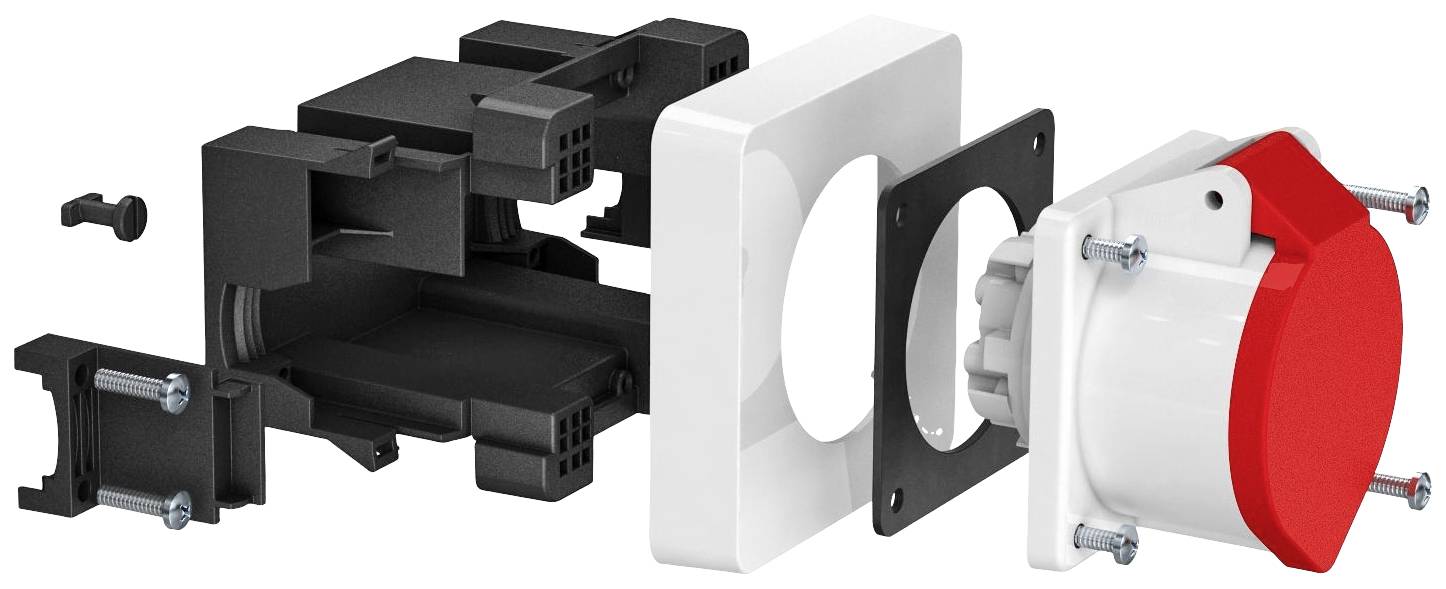 Geräteeinbaudose zum Einbau einer 3- oder 5-poligen CEE-Steckdose 16 A oder 32 A. Lieferumfang: - 1 frontrastende Geräteeinbaudose mit 4-Punkt-Befestigungsspur von 52 x 52 mm bis 70 x 70 mm - 1 Abdeckrahmen in reinweiß zur Kaschierung der Befestigungstechnik - 2 außenliegende Zugentlastungen für Mantelleitungen bis Ø 18 mm - 2 Drehriegel zur optionalen Befestigung an Kanalböden mit C-Schiene - 1 CEE-Steckdose 32 A mit Montagezubehör