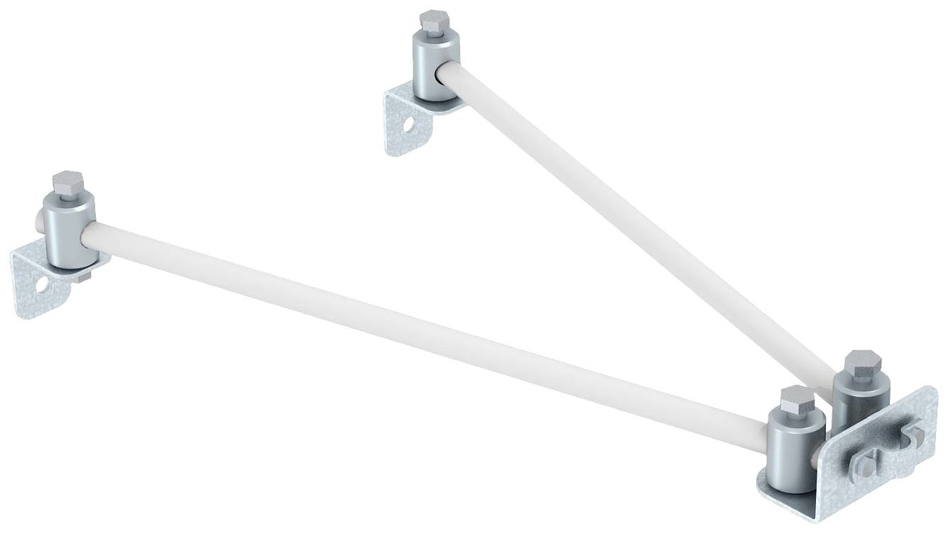 V-Befestigung: Für eine isolierte Fangeinrichtung im Trennungsabstand s. Montage an Wänden und Dachaufbauten mit zwei Wandanschluss-Winkeln. Zur Aufnahme von Fangstangen und Rundleitern mit 8, 16 und 20 mm Durchmesser