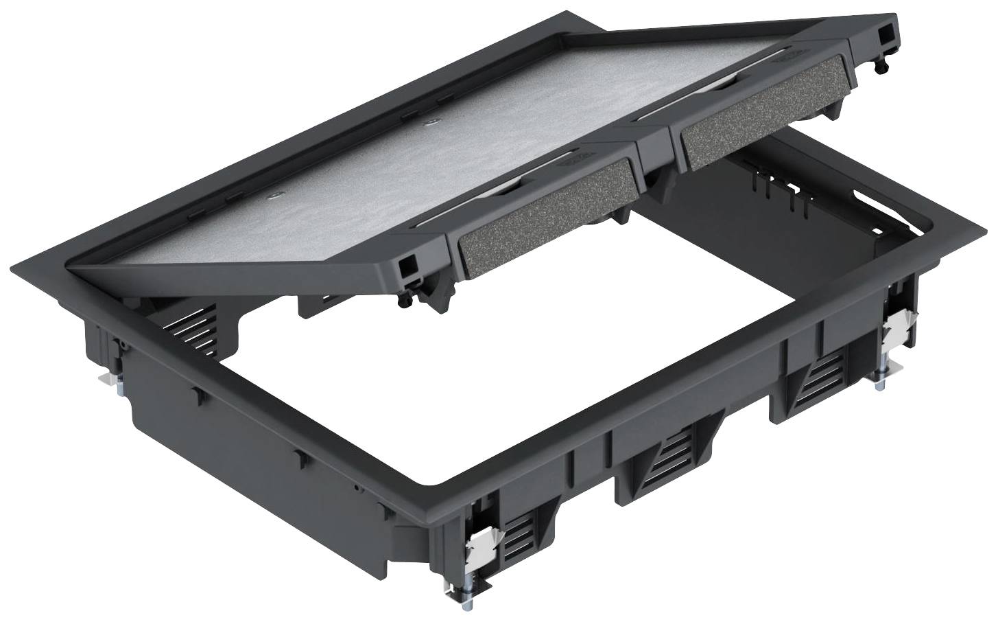 Für trockene Räume mit trockengepflegten Fußböden nach DIN VDE 0634 Teil 1.Anwendung: Zum Einbau von Gerätebechern für Einzel-Installationsgeräte der Starkstrom-, Telekommunikations- und Datentechnik. Bei Verwendung von Mehrfach-Installationsgeräten kann die Anschlusskapazität vergrößert werden.Ausführung: Die Geräteeinsätze sind halogenfrei und bestehen aus: Teppichschutzrahmen inklusive Gerätebecher-Einsatzrahmen mit Rastleitern zum stufenweisen Absenken der Gerätebecher in 5-mm-Schritten um max. 20 mm; Klappdeckel, im Teppichschutzrahmen unverlierbar gelagert, verrastbar, selbsttätig zufallend, inkl. stabiler Druckaufnahmeplatte aus 4-mm-Stahlblech, feuerverzinkt, schwenkbarem Schnurauslass mit Schaumstoffdichtung, versenkbarem Griffbügel zum Öffnen des Deckels. Material: Polyamid, sichtbare Oberfläche mattiert.Zum Einbau von sechs Einzel-Installationsgeräten in drei Gerätebecher GB 2. Einschließlich sechs Befestigungswinkel im Beipack.