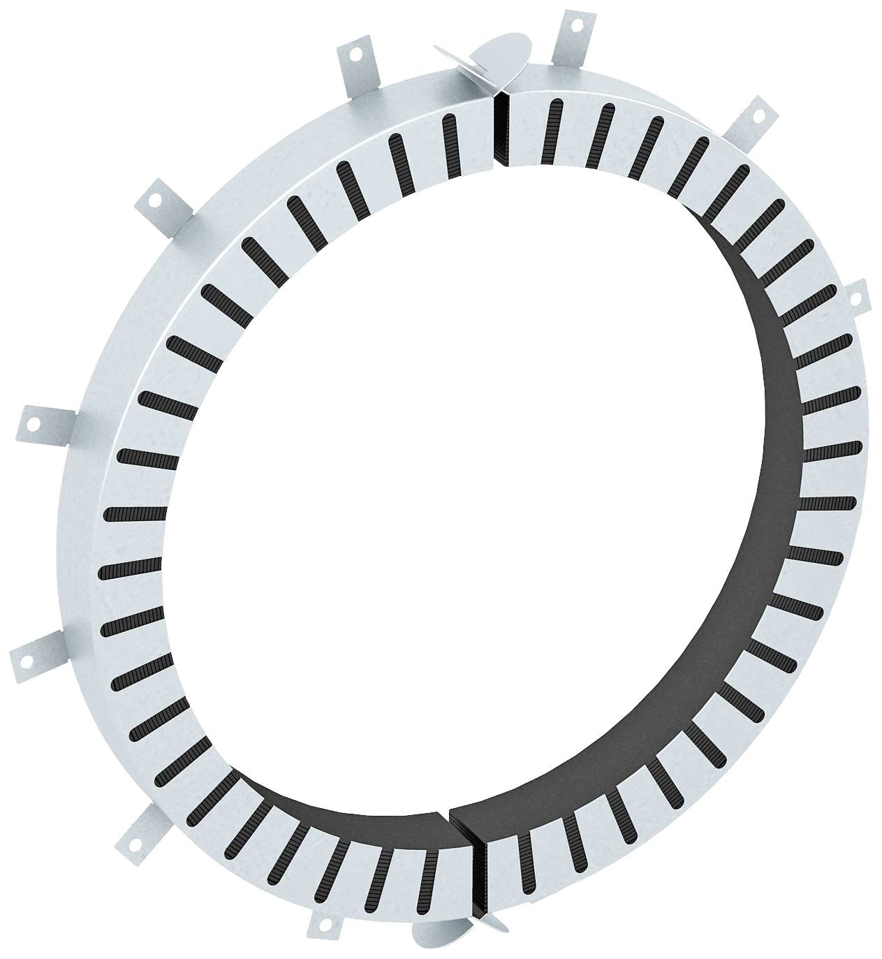 Rohrmanschette für brennbare Rohre. Im Stahlblechgehäuse eingefasste Brandschutzeinlagen drücken im Brandfall die abbrennenden thermoplastischen Rohre mit sehr hohem Blähdruck zu. Befestigung mit Dübeln oder Gewindestangen M8. Für Rohrdurchmesser 400mm geeignet.