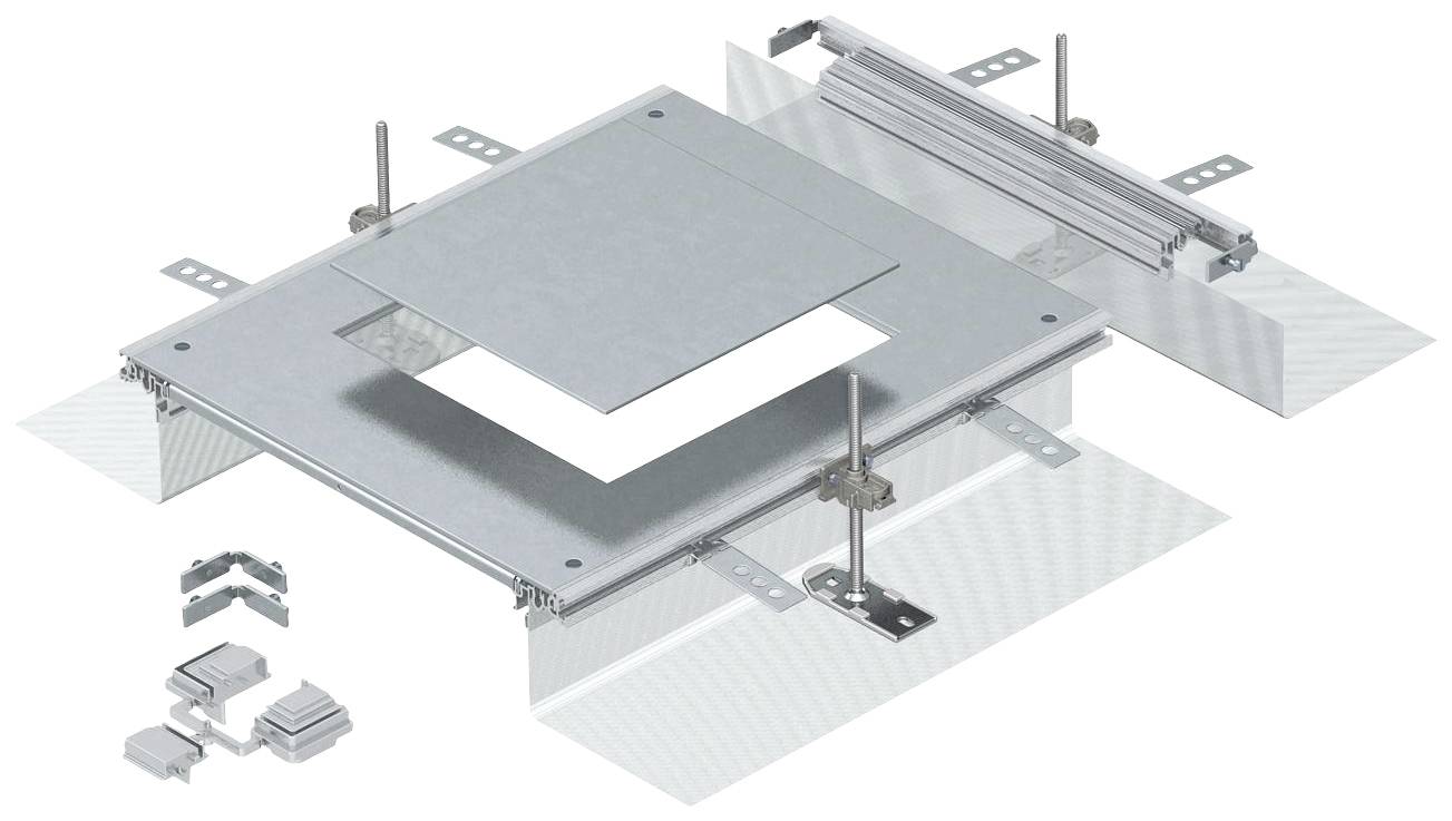 Montagefertige Kanalanbaueinheit mit einem Geräteeinbaudeckel zur Montage einer Einbaueinheit der Nenngröße 9. Seitenwände aus flexiblen Metallgewebe.