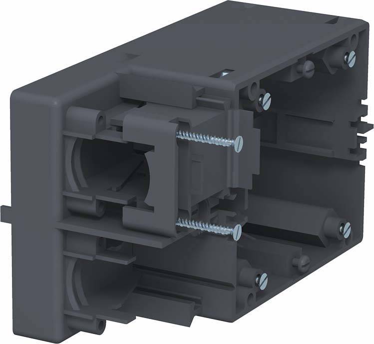 Installationskanaldose zum Einbau einer CEE-Steckdose mit 4-Punkt-Befestigungsspur 60 x 60 mm oder 70 x 70 mm; mit außenliegender Zugentlastung für Mantelleitungen bis Ø 18 mm; mit Exzenterriegel zur schraubenlosen Schnellbefestigung