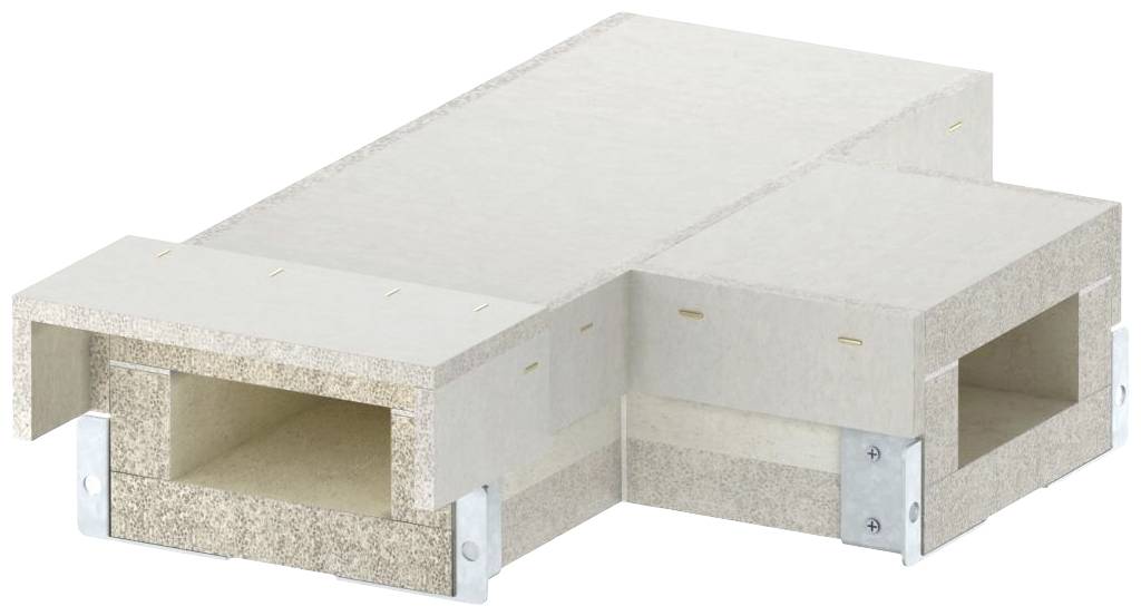 T-Stück für BSKH I90/E30, gem. DIN 4102 Teil 11 und Teil 12, zur Installation auf OBO Montagesystemen. Formteile müssen durch zusätzliche Ausleger unterstützt werden. Inkl. fertig montierter Verbinder an allen Kanalenden, 3 x 1 m selbstklebender Dichtungsstreifen und Verbindungsschrauben.
