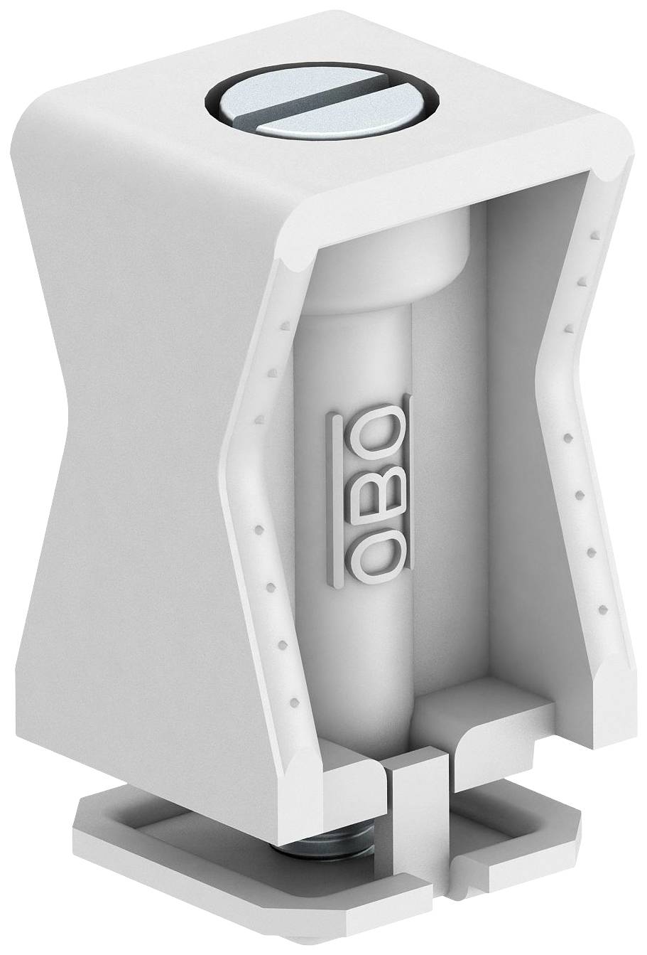 Reihenschelle mit Schlitzschraube, geeignet für Schiene mit Schlitzweite von 11 ÷ 12 . Schellenkörper bestehend aus schlagfestem Polystyrol in reinweiß RAL 9010. Mit einer Schraube aus galvanisch verzinktem Stahl.