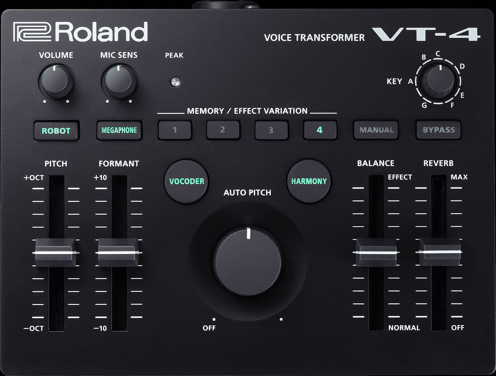 Herausragend klingende Tonhöhen- und Formant-Effekte sind eine Seltenheit, erst recht ohne den Einsatz eines Computers. Insbesondere die Echtzeit-Bearbeitung dieser Effekte resultiert in hässlichen Klangartefakten und weiteren Problemen. Mit dem VT-4 kannst du sowohl die Tonhöhe als auch die Formanten über eigenständige Fader gleichmäßig und ohne Umwege justieren. Auf diese Weise kannst du deine Stimme nach Belieben verändern: Wechsle das Geschlecht, klinge wahlweise groß oder klein, himmlisch oder teuflisch.