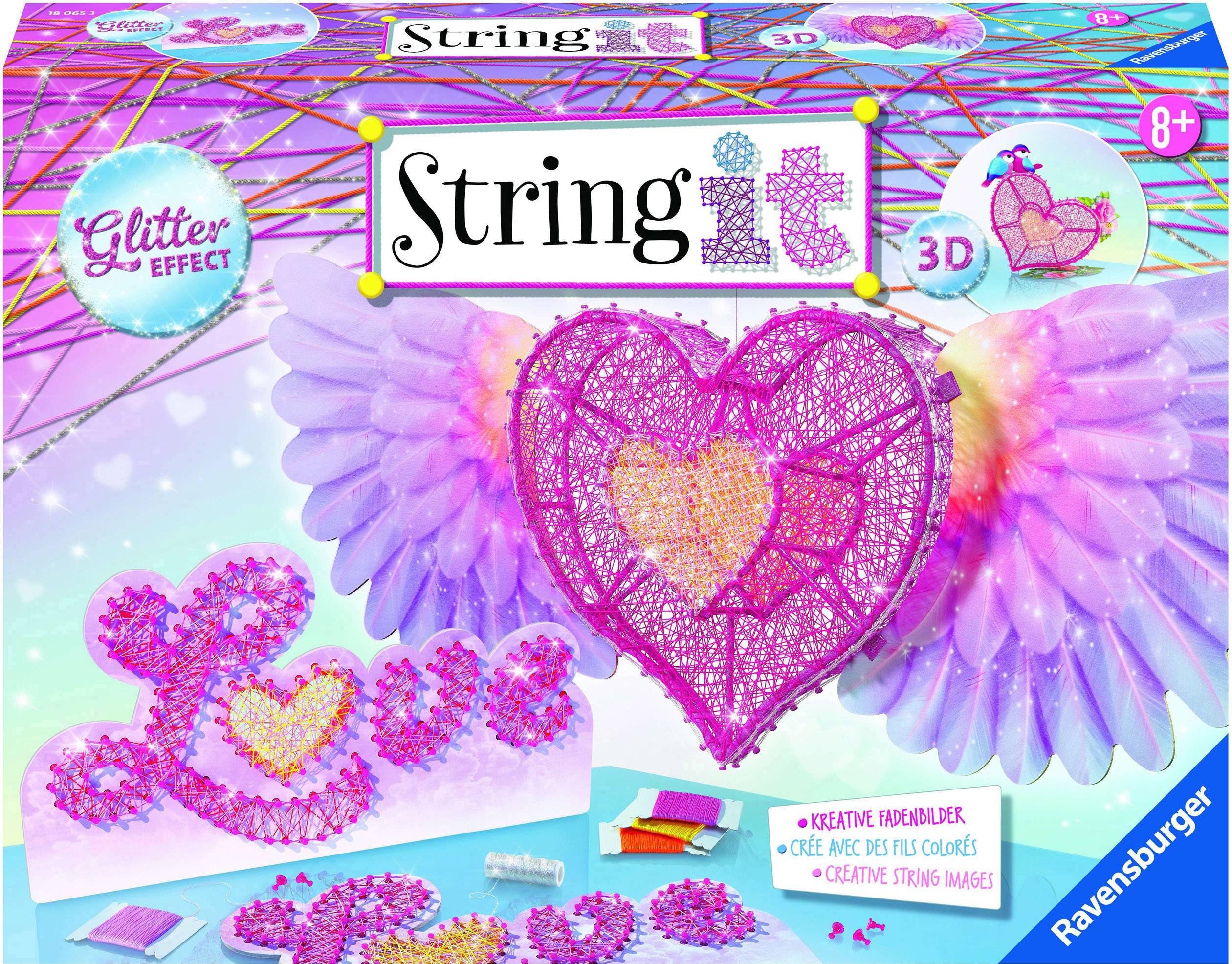 Love is everywhere! ? Kreiere dein eigenes 3D Herz und deine individuelle ?Love?-Bildtafel. Mit Ravensburger String it kannst du aus einem dreidimensionalen Kunststoffherz dein ganz persönliches Kunstwerk zaubern. Spanne dazu einfach die bunten Fäden und das Glitzergarn nach deinem Geschmack um das Herz. Der Glitzer-Effekt und die Ansteckteile verleihen deinem Herz einen ganz besonders romantischen Charme! Und glitzern wird natürlich auch deine ?Love?-Bildtafel, die in jedem Zimmer zum echten Hingucker wird!