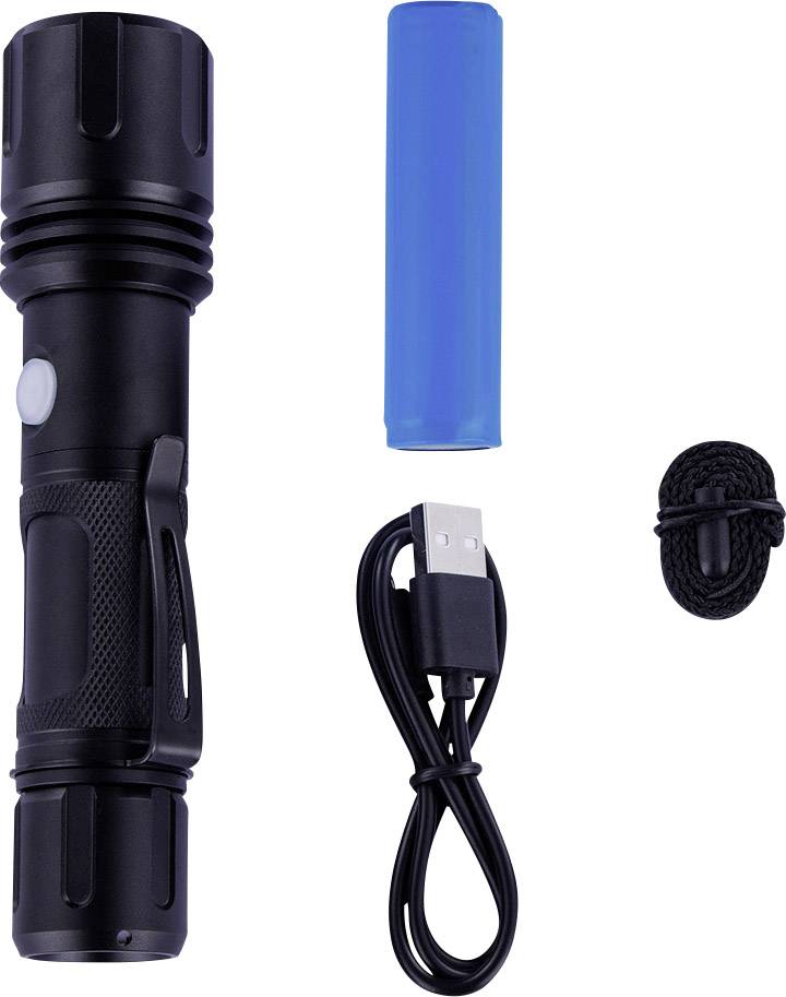 Die handliche Taschenlampe mit CREE XPG3 LED-Chip kann in 3 Modi, bei 100% Lichtintensität, bei 20% Lichtintensität und Blinkfunktion verwendet werden. Die Lampe ist Fremdkörper- und spritzwassergeschützt (IPX4). Die Farbtemperatur ist hellweiß (5000K). Diese Lampe funktioniert mit einem Lithium-Ionen-Akku für 3 Stunden (100% Modus). Mit Zoom-Funktion durch Drehen und einer Farbwiedergabe (CRI) von mehr als 80.