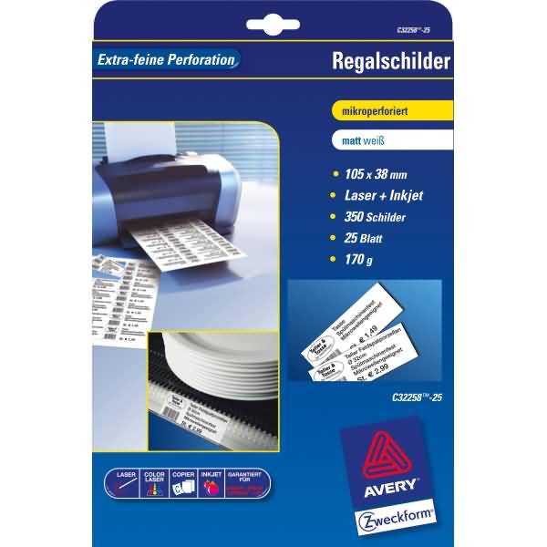 Avery C32258-25. Produktfarbe: Weiß, Form: Rechteck, Etikettengröße: 105 x 38 mm. Aufkleber pro Satz: 350 Stück(e), Haftetiketten pro Blatt: 14 Stück(e), Medienanzahl pro Paket: 25 Blätter