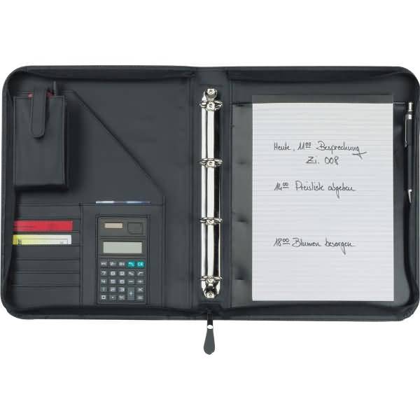 Konferenz- und Ringbuchmappe aus schwarzem Kunstleder, mit 4-Ring-Reißmechanik, Ring-Durchmesser 30 mm, Größe passend für DIN A4-Prospekthüllen, Einsteckfach auf Außenseite, 8-Digit-Solar-EURO-Taschenrechner, angeschnittenes Einsteckfach mit zusätzlichen kleinen Fächern für Visitenkarten etc. und Handy-Tasche auf Deckelinnenseite, Schreibgerätelasche und Block DIN A4, Rundum-Reißverschluss, einzeln im Karton verpackt.