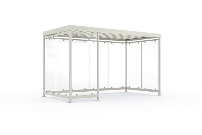 formschön und von allen Seiten einsehbar aus verzinkten Stahlprofilen und Sicherheitsglas · tragende Rahmenkonstruktion aus Profilrohren mit Fußplatte zum Aufdübeln · Rück- und Seitenwände aus Einscheibensicherheitsglas (ESG), glashell mit Glashaltern befestigt · Dach aus umlaufendem Abkantprofil (150 mm) mit innen liegender bitumierter Wasserrinne und Eindeckung aus Profilblech, Entwässerung durch hinteren Eckpfosten · gesamte Konstruktion ist verzinkt und mit Zweikomponenten-Lackierung beschichtet · Dachblech (Untersicht) beschichtet grauweiß, RAL 9002 · Schneelastannahme 190 kg/m² · Lieferung erfolgt fertig montiert · inklusive Kranentladung · inklusive Edelstahl-Bodenbefstigungsmaterial Weitere technische Eigenschaften: · Material: Stahl verzinkt u. beschichtet · Ausstattung: Seiten-/Rückwand aus ESG-Glas
