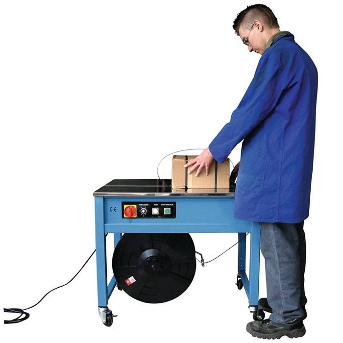 halbautomatisch · stabile, fahrbare Ausführung · mechanisch einstellbare Bandspannung · Verschweißung der Bandenden · stufenlos regelbarer Bandmengenvorlauf · Tischgröße L 910 x B 580 mm · Tischhöhenverstellung von 770 - 915 mm · kleinste Packgutgröße 60 x 60 mm · für PP-Automatenbänder 12 mm · Spulen-Ø 200 mm · max. Bandspannung 650 Newton · Netzanschluß 230 V · Gewicht 85 kg Weitere technische Eigenschaften: · Gewicht: 85kg