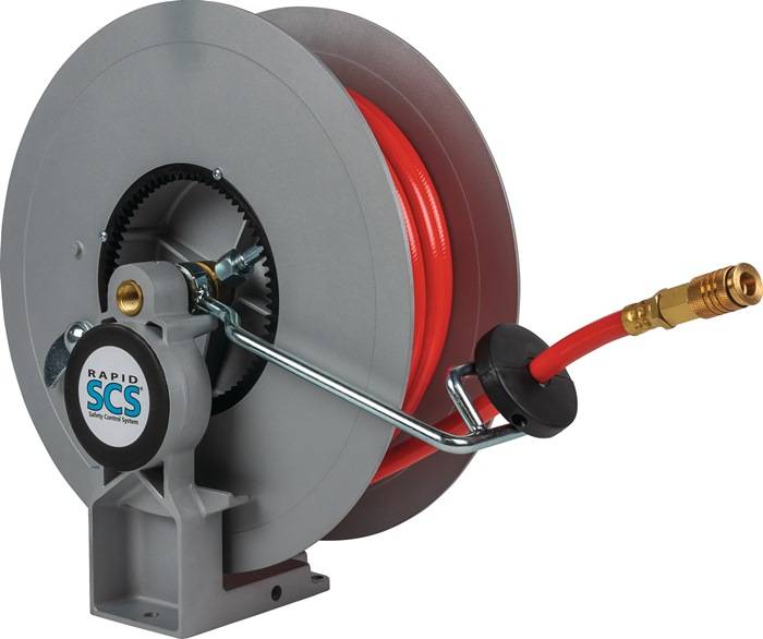 für Luft, Öl und Wasser · mit kontrollierter Aufrolltechnik durch SCS-System, dieses begrenzt die Rückzugsgeschwindigkeit auf ein ungefährliches Maß für Mitarbeiter und Maschinen · für Druckluft, Wasser und ÖL DN 12 · mit verzinktem, schwenkbaren Auslaufbügel · inkl. Spezial-PVC-Schlauch DN 10 und Stopper · aus Aluminiumdruckguss · Mehrfachrasterung pro Umdrehung · für die Montage an Boden, Wand und Decke sowie an Fahrzeugen und Geräten geeignet Weitere technische Eigenschaften: · Ausführung: für Luft, Öl und Wasser
