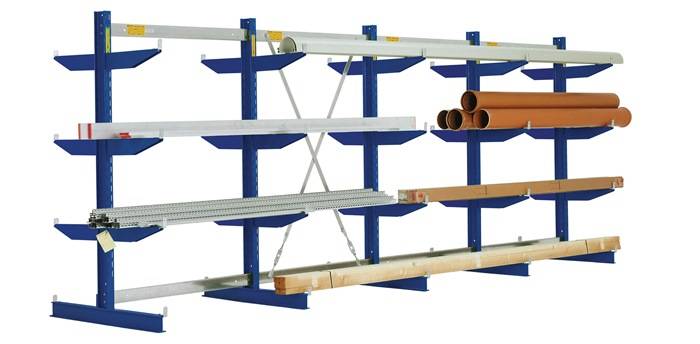 Komplett-Angebot · komprimierte Lagerung von Stangen, Rohren, Profilen usw. · solide Stahlkonstruktion aus Doppel-T-Profilen, pulverbeschichtet, Farbe enzianblau, RAL 5010 · Ständerachsmaß 1251 mm, mit 5 Ständern und je 3 Kragarmen je Ständerseite · schraublose Montage der Kragarme, höhenverstellbar im 60-mm-Raster Weitere technische Eigenschaften: · Ausführung: 4 Felder · Achsmaß: 1251mm · prüfpflichtig: ja