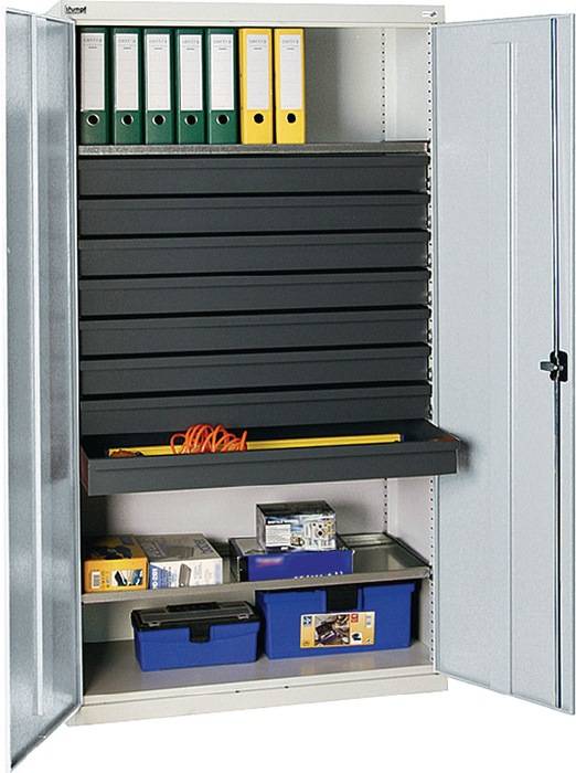 Stahlblechkonstruktion mit widerstandsfähiger Pulverbeschichtung · ausgestattet mit Schubladen H 100 mm und ausziehbaren, verzinkten Fachböden, mit allseitigem Rand, Höhe 30 mm, auf kugelgelagerten Präzisionsauszügen, 100 % ausziehbar · Schubladen, H 100 mm und Fachböden im 25-mm-Raster höhenverstellbar · Tragfähigkeit pro Fachboden/Schublade 35 kg · Flügeltür abschließbar mit Zylinderschloss und Drehriegelverschluss mit 3-Punkt-Verriegelung Weitere technische Eigenschaften: · Tragfähigkeit pro Schublade: 35kg