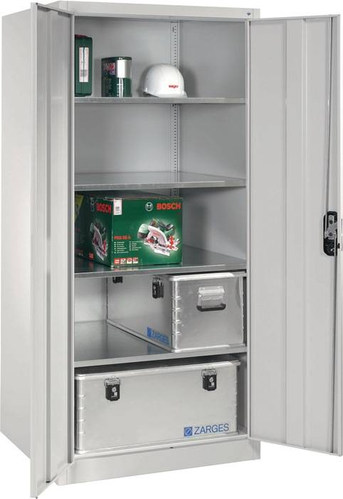 robuste Stahlblechkonstruktion mit hochwertiger Einbrennbeschichtung · Flügeltüren in Drehbolzen gelagert · Türöffnungswinkel 110° · 3-riegeliges Muldengriffschloss mit 2 Schlüsseln, zum Schließen einfach zudrücken · 4 verzinkte Fachböden, höhenverstellbar, im 15-mm-Raster Tragfähigkeit pro Boden 70 kg · Schrankbelastbarkeit ca. 450 kg