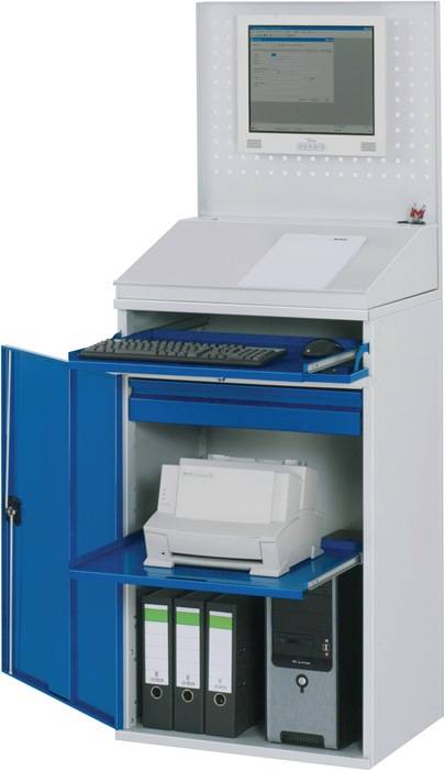 stabiles Stahlblechgehäuse, mit umweltfreundlicher Pulverbeschichtung · Gestell/Gehäuse lichtgrau, RAL 7035 · Schubladen/Türen enzianblau, RAL 5010 · Kabeldurchlässe an der Gehäuserückseite, im Deckel sowie im Innenteil · Tastaturfach H 120 mm mit Frontklappe, abschließbar und Auszugsboden für Tastatur- und Mausauflage · Auszugböden B 370 x T450 mm verstellbar, auf Präzisionsgleitschienen, 80 % ausziehbar, Tragfähigkeit 20 kg · Lochplattenaufsatz B 450 mm für Bildschirmmontage geeignet · Schreibpultaufsatz mit Klappdeckel B 450 mm x T 520 mm x H 50/160 mm · Lieferung komplett montiert Weitere technische Eigenschaften: · Ausführung: stationär