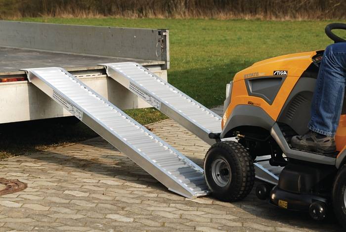 mit und ohne Schutzrand für luftbereifte Fahrzeuge · aus Aluminium · Tragfähigkeit 4400 kg pro Paar · hohe Traglasten bei geringem Eigengewicht · Oberfläche rutschsicher · Sicherungslasche oder Sicherungsöse, zusätzlich Sicherungsbolzen (Abrutschsicherung) · Tragfähigkeit bei Achsabstand = 2000 mm