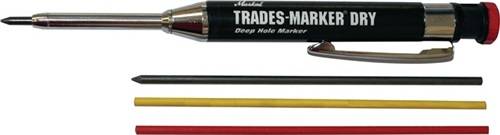 TRADES-MARKER® DRY ist ein automatischer Graphit-Fallminenstift mit dünner, extralanger Spitze · der komplett aus Metall gefertigte Stift ist deutlich robuster als Kunststoffstifte und verfügt über einen genialen, äußerst praktischen integrierten Minenspitzer und Halteclip · er kann ebenfalls mit Farbminen auf hellen oder dunklen Oberflächen verwendet werden