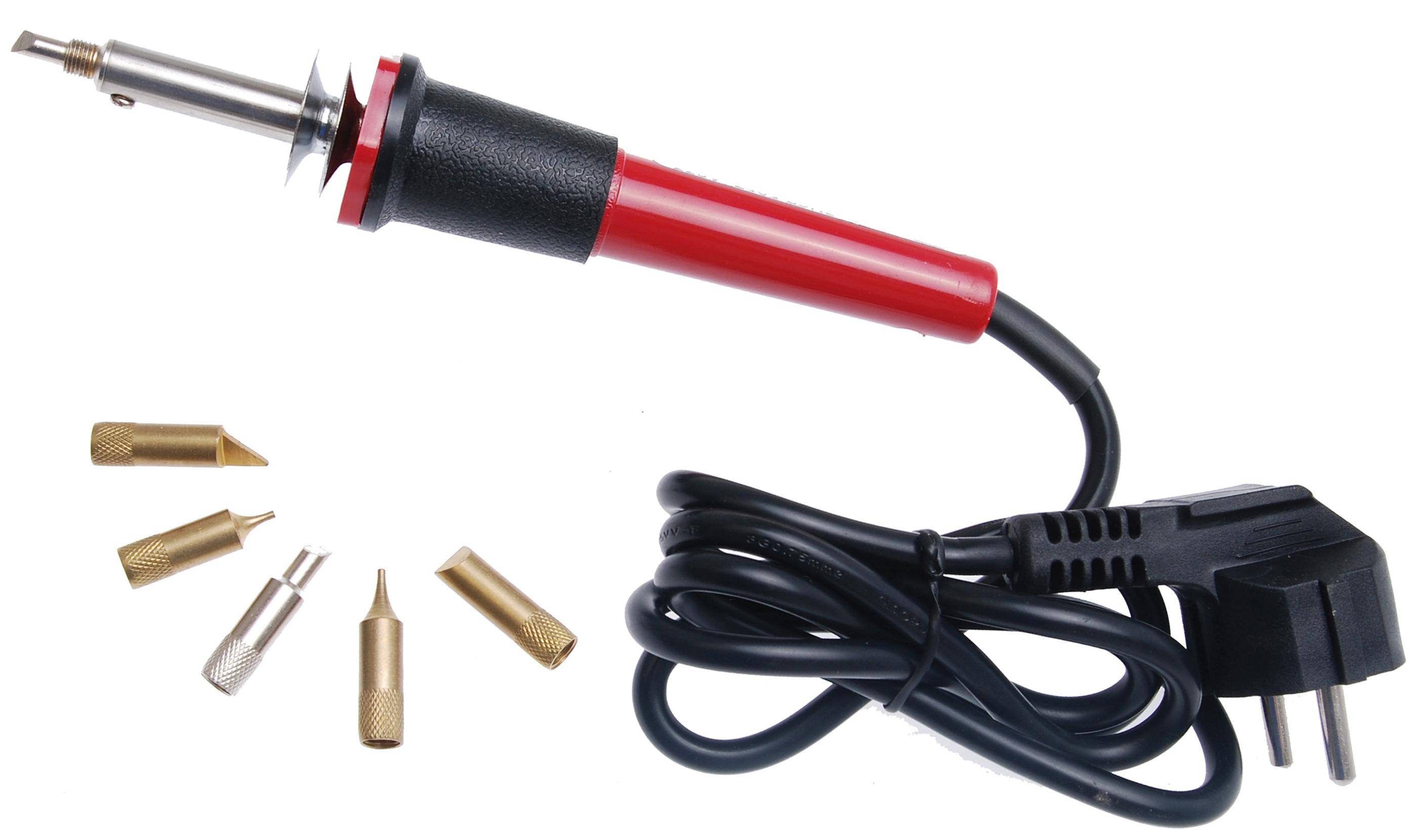 für Holz, Leder und Kork VDE-Stecker Lieferumfang: 1 Brenn- und Lötkolben 30 W 1 Ablageständer 1 Meißelspitze 1 kurze Spitze 1 lange Spitze 1 Messerspitze Lötkolbenspitze