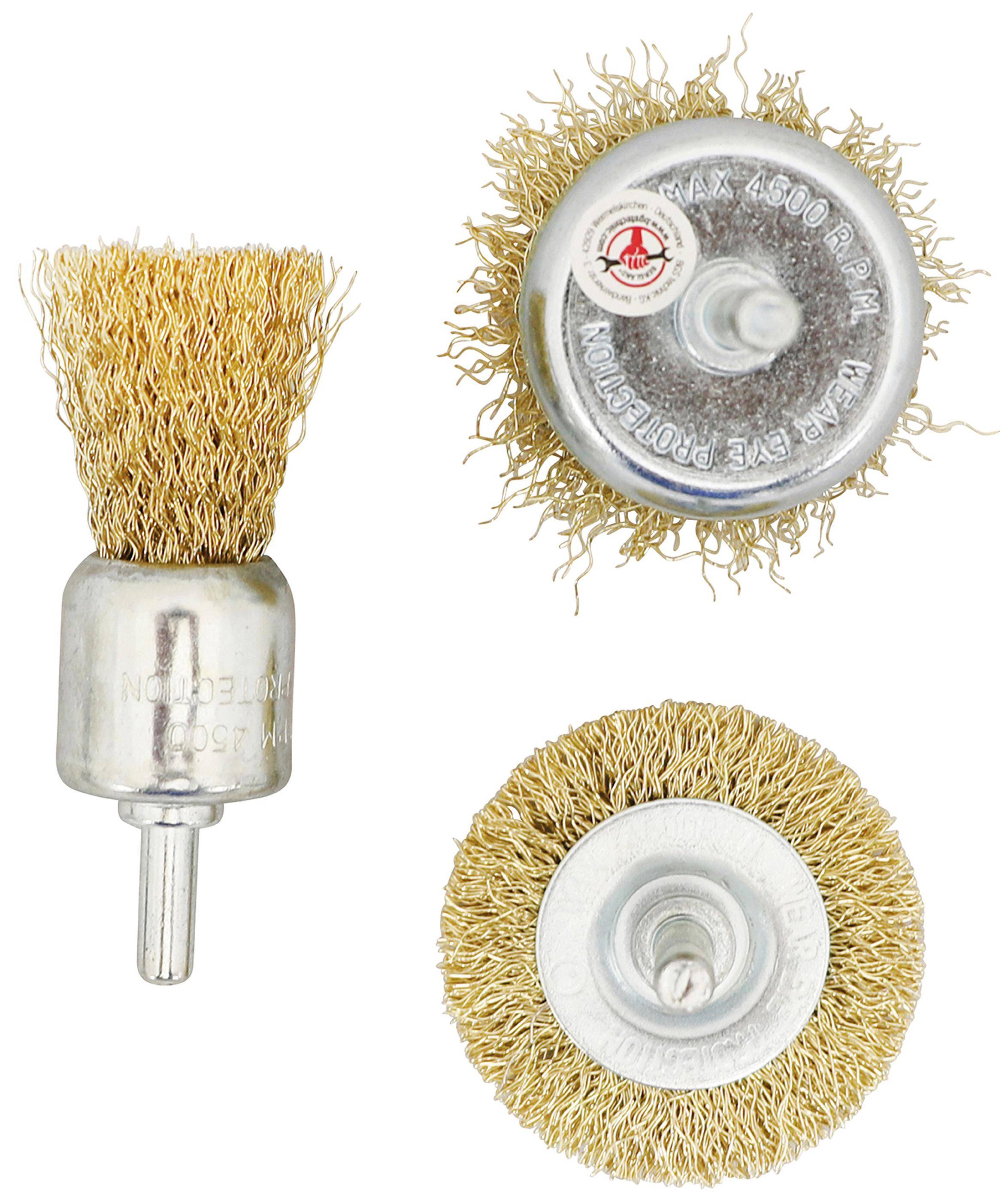 für Bohrmschinenantrieb zum Bearbeiten von geraden und gewölbten Flächen gewellte Borsten 6 mm Aufnahmeschaft Lieferumfang: Topfbürste, Ø 50 mm Scheibenbürste, Ø 50 mm Pinselbürste, Ø 25 mm