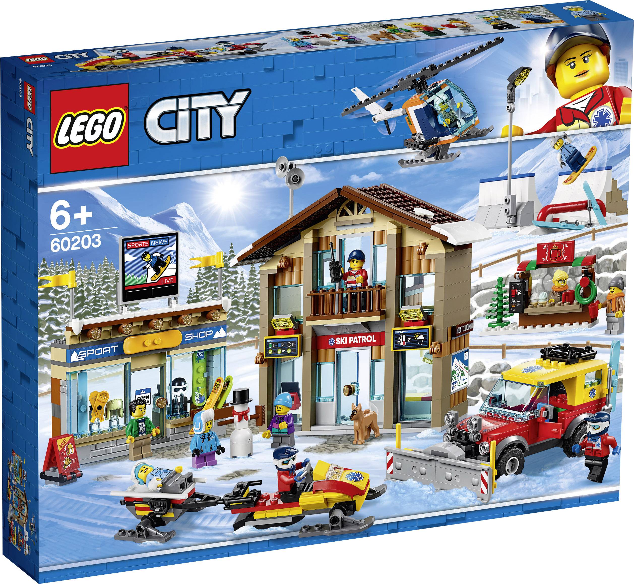 Mit diesem vielfältigen Winterset erwartet alle kleinen Sportler ein aufregendes Abenteuer. Das coole LEGO® City Set „Ski-Resort“ (60203) umfasst eine zweistöckige Rettungsstation, einen Ski-Shop mit großem Bildschirm sowie Snowboard- und Ski-Regal und einen Stand mit heißen Getränken und Cupcakes. Außerdem gibt es einen coolen Schneepark mit Flutlichtmast, Halfpipe und Rail. Dieses großartige Bauset für Kinder enthält außerdem einen Allrad-Truck mit beweglichem Schneepflug, ein Schneemobil mit Anhänger, einen Hubschrauber mit aufklappbarem Cockpit, drehbaren Rotoren und einer Kamera sowie 11 Minifiguren, eine Hundefigur und eine Schneemannfigur zum Zusammenbauen.