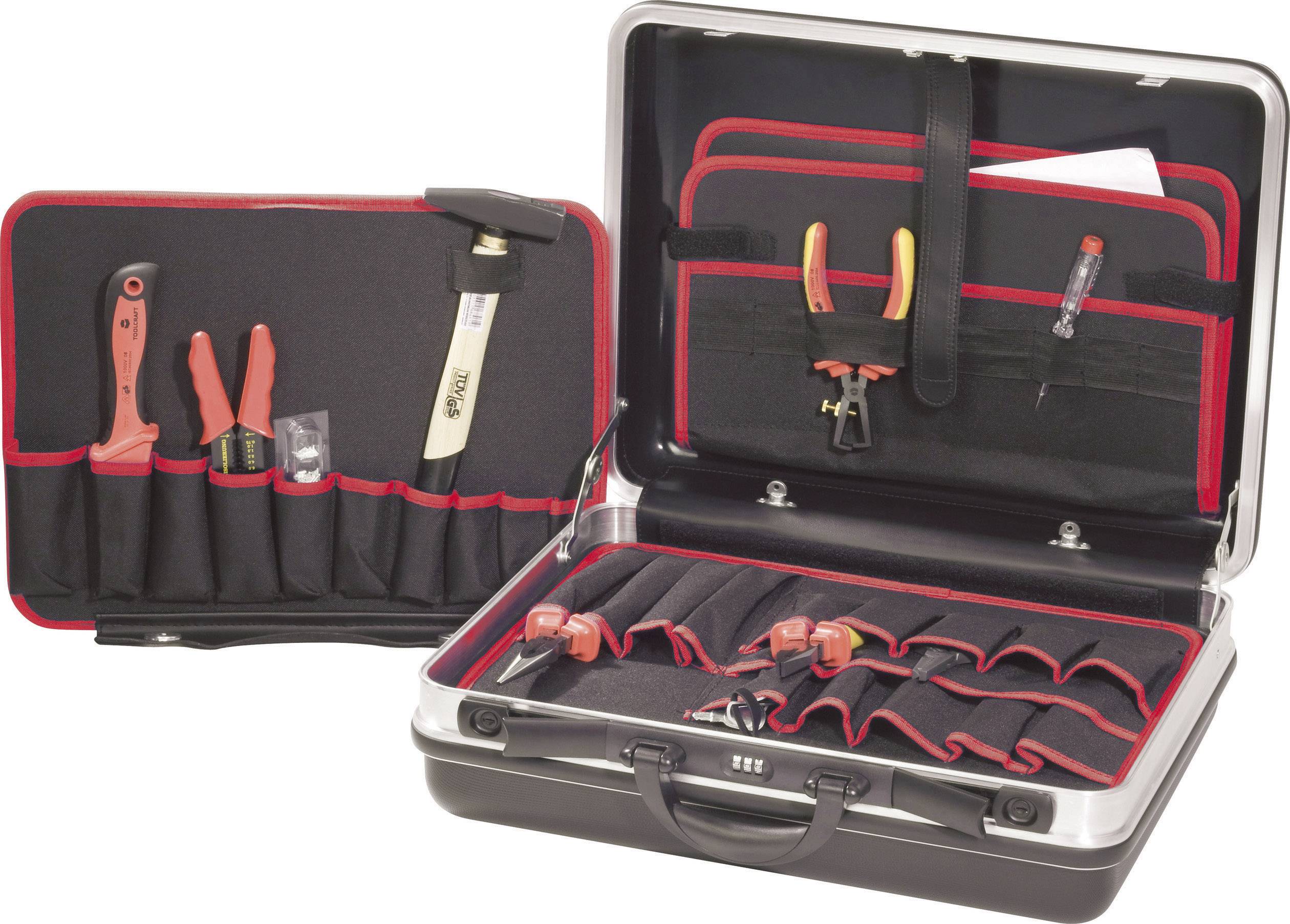 2poliger Spannungsprüfer Voltcraft VC-62 · 7tlg. Wiha VDE Schraubendreher-Satz: 4 Schlitz: 2,5 x 75/4,0 x 100/5,5 x 125/6,5 x 150 mm, 2 Kreuzschlitz: PH 1 x 80/PH 2 x 100 mm · Autom. Abisolierzange 0,2 - 6 mm² · VDE-Kabelmesser 220 mm · Aderendhülsen-Presszange 160 mm 0,5 - 2,5 mm² · 150 unisolierte Aderendhülsen von 0,5 bis 2,5 mm² · Presszange für isolierte Steckverbinder 0,75 - 6 mm² · VDE-Seitenschneider 160 mm · VDE-Kombizange 160 mm · VDE-Flachrundzange 200 mm · Abisolierzange 160 mm · Phasenprüfer · Gliedermaßstab 2 m · Schlosserhammer 300 g · Schaltschrankschlüssel: Schlüsselgrößen: Außen-Vierkant: 6/8 mm, Außen-Dreikant: 9 mm, Doppel-Bart: innen Ø 5/außen 9 mm, Vierkant 5 mm, Wendebit Schlitz: 1,0 x 7,0 mm/Kreuzschlitz: PH 2 · Hartschalenkoffer.