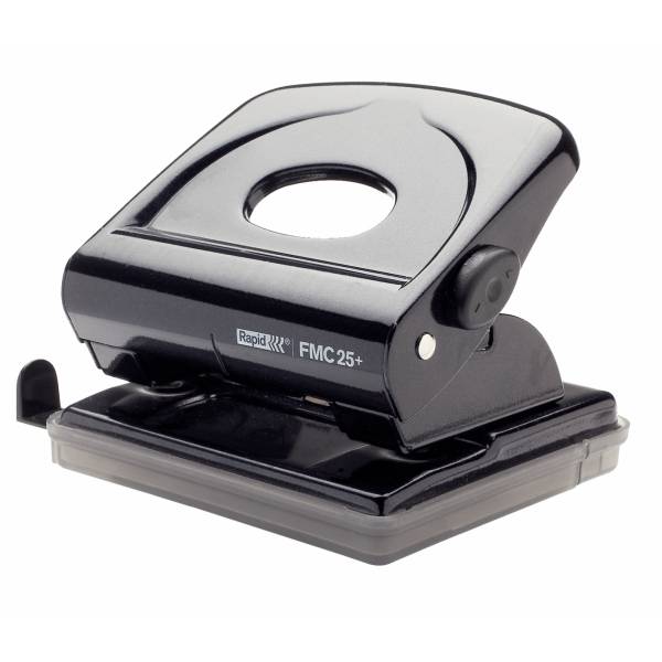 Rapid Starker Bürolocher FMC25+, mit Anschlagschiene aus Kunststoff, Oberteil arretierbar für platzsparendes Verstauen, mit großem Abfallkasten. Stanzleistung/Blatt: 3mm/30. Material: Metall. Farbe: schwarz.