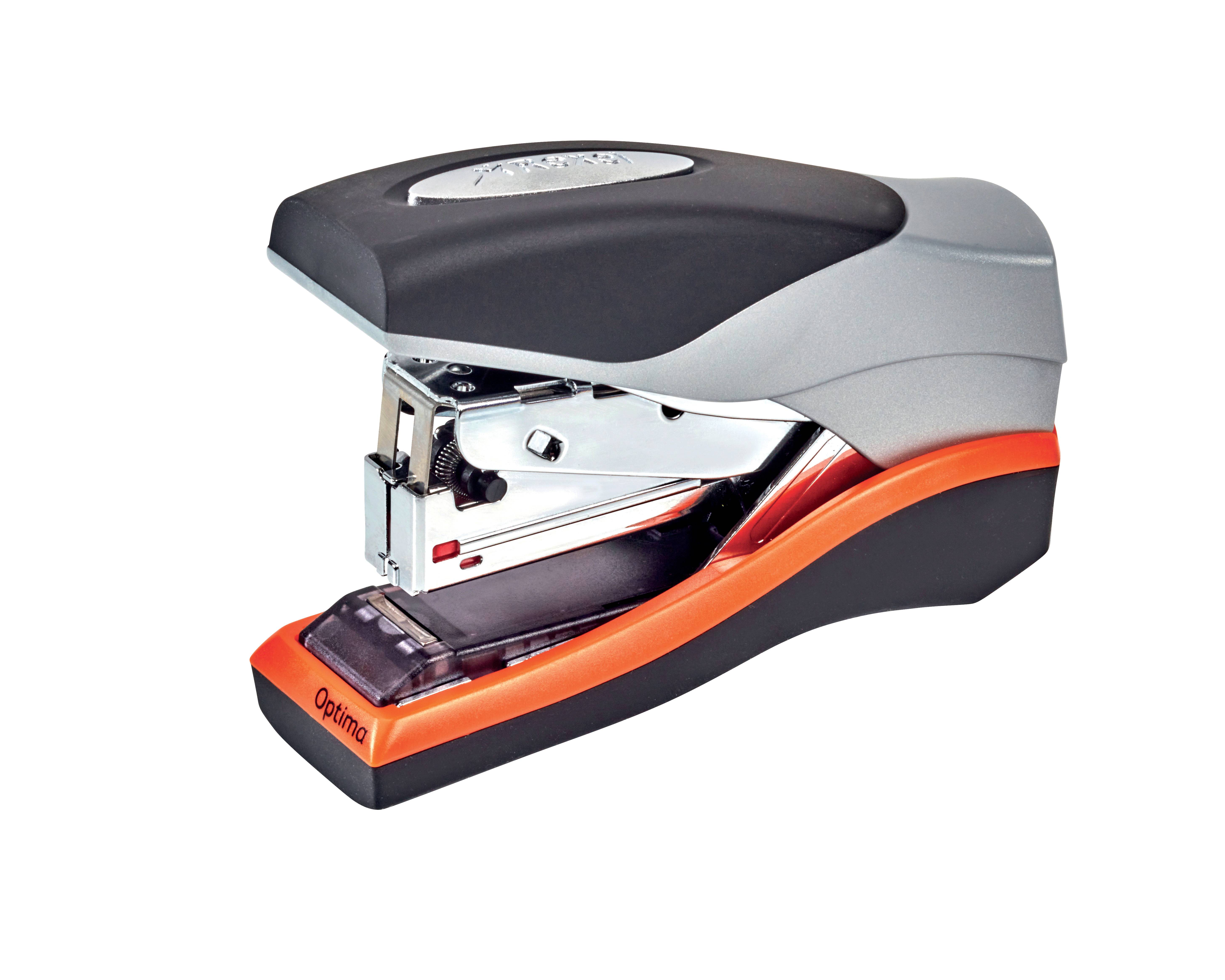 Bei Verwendung von Optima Heftklammern bietet er platzsparende Flachheftung mit bis zu 50% weniger Kraftaufwand. Mit Heftklammer-Vorratsfach zur Aufbewahrung von Reserve-Heftklammern.
